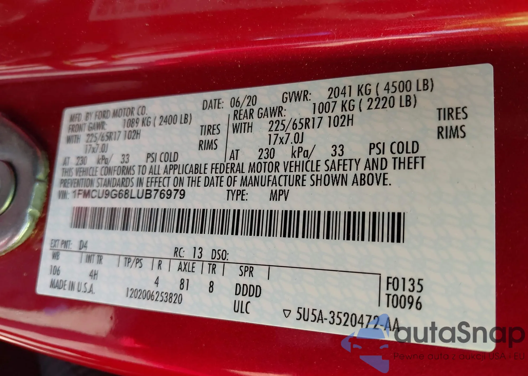 LOT: 42811146 VIN: 1FMCU9G68LUB76979