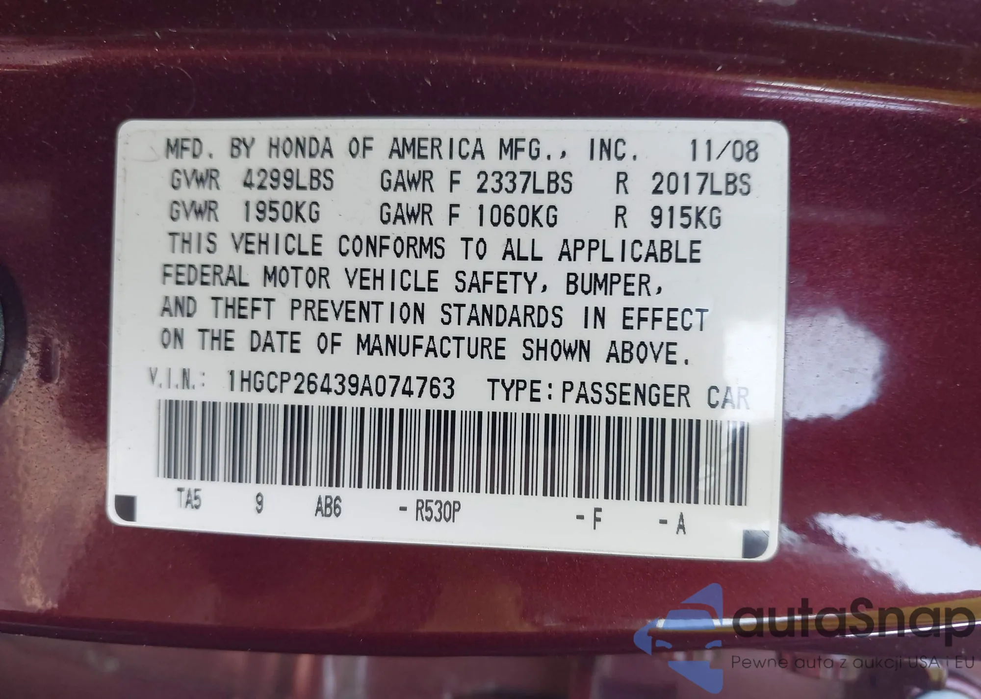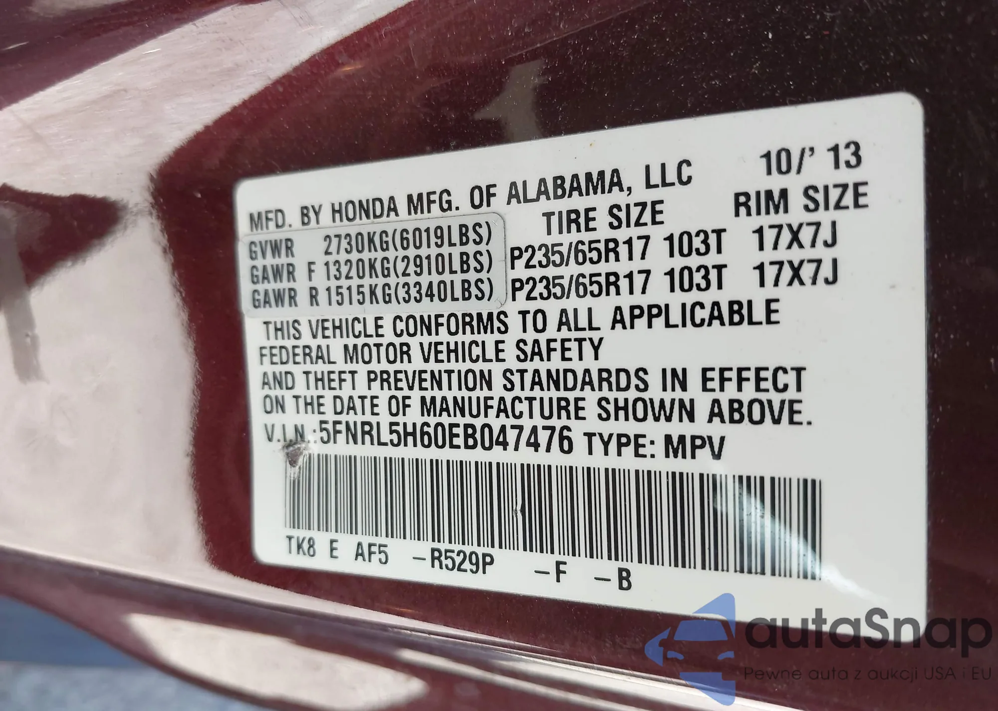 • VIN 5FNRL5H60EB047476