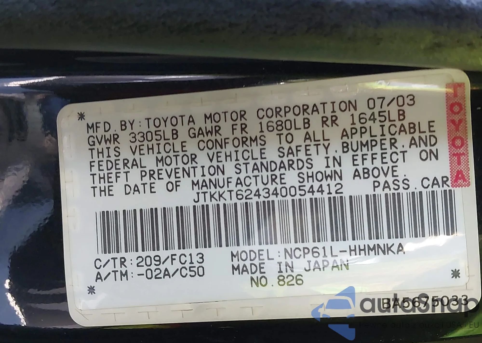 LOT: 43193993 VIN: JTKKT624340054412