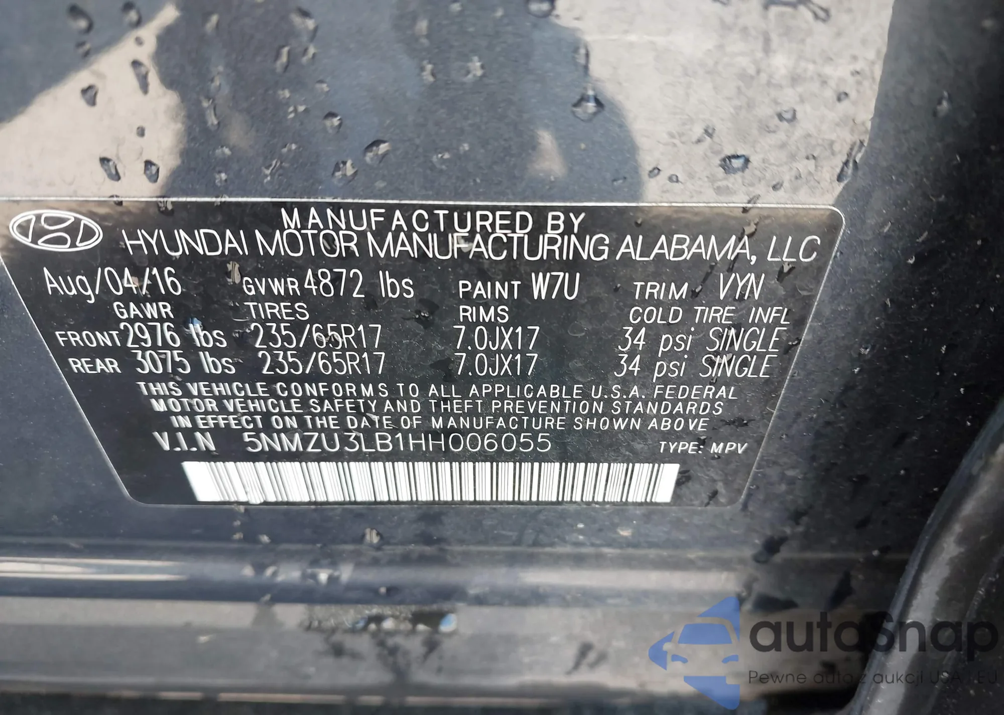 • VIN 5NMZU3LB1HH006055