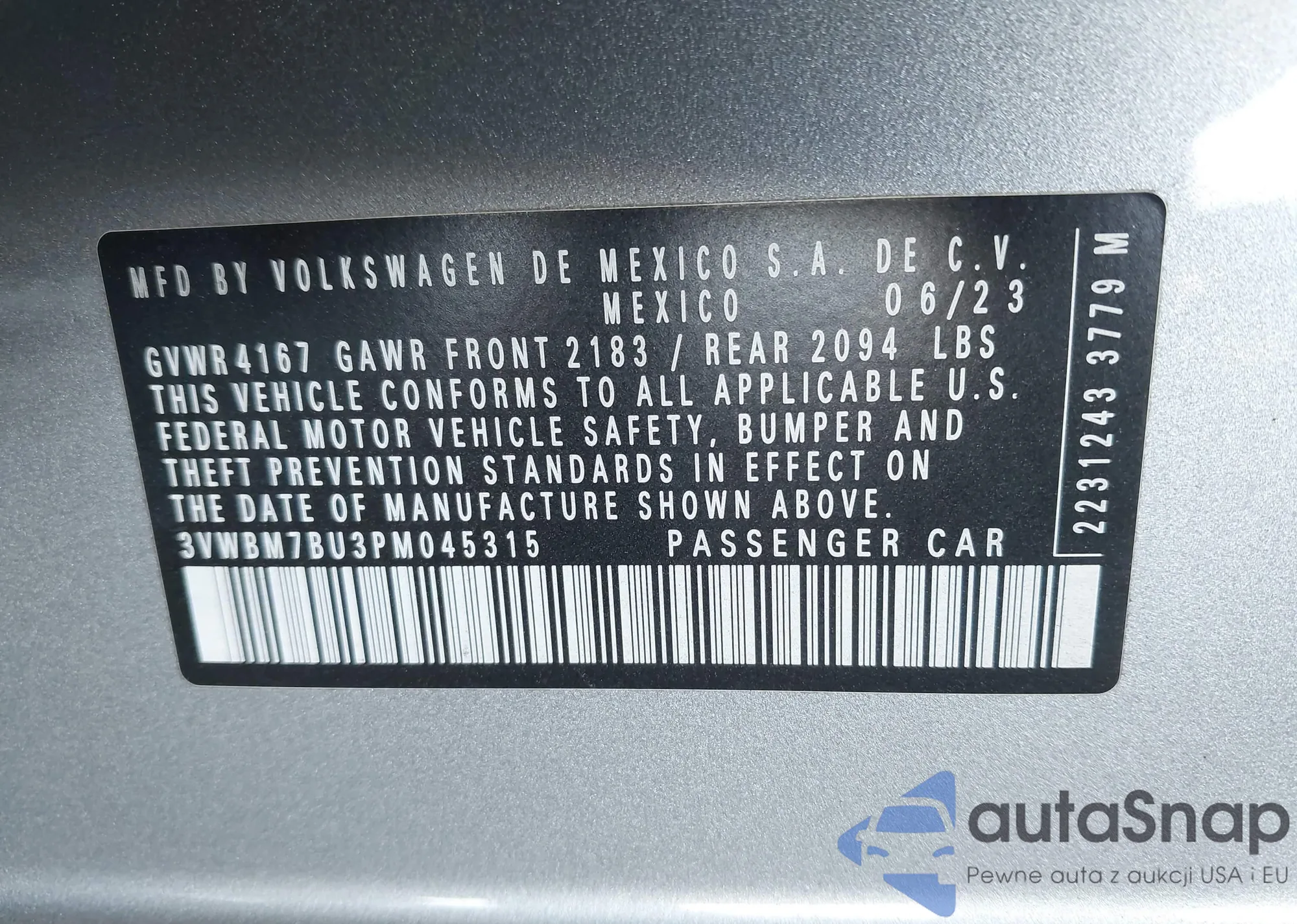 • VIN 3VWBM7BU3PM045315