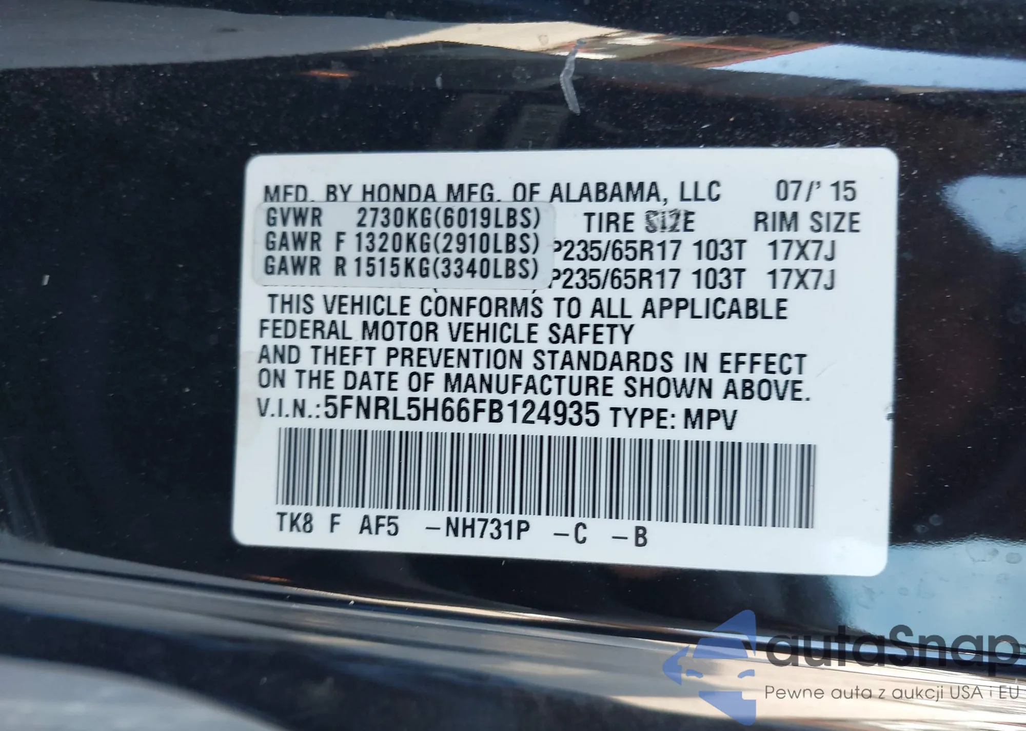 • VIN 5FNRL5H66FB124935
