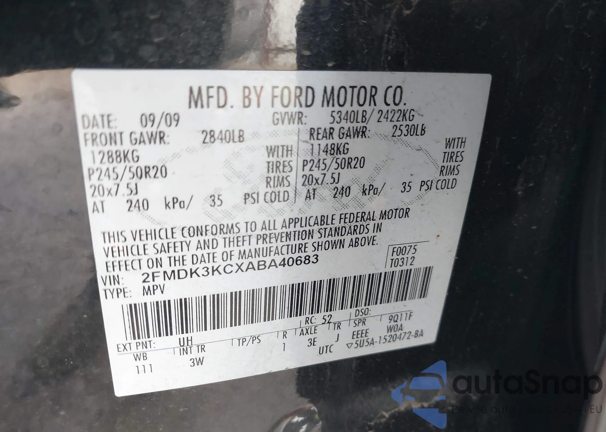 LOT: 43056567 VIN: 5UXFE43589L273952