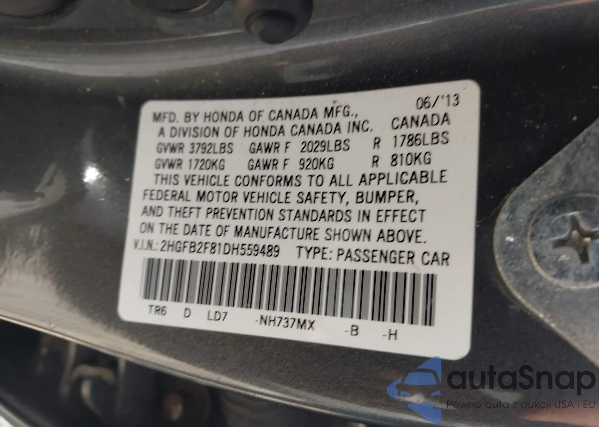 LOT: 43174717 VIN: 2HGFB2F81DH559489