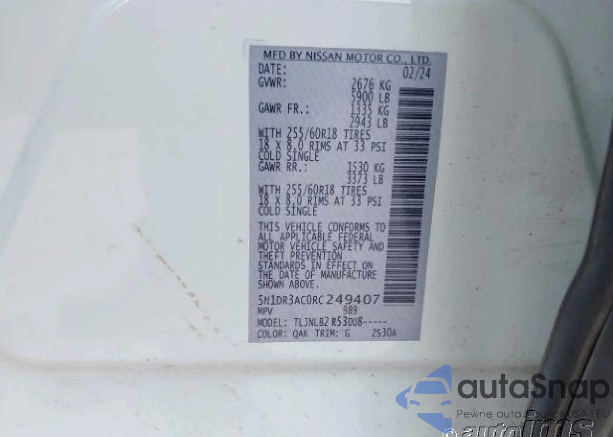 LOT: 43306879 VIN: 5N1DR3AC0RC249407