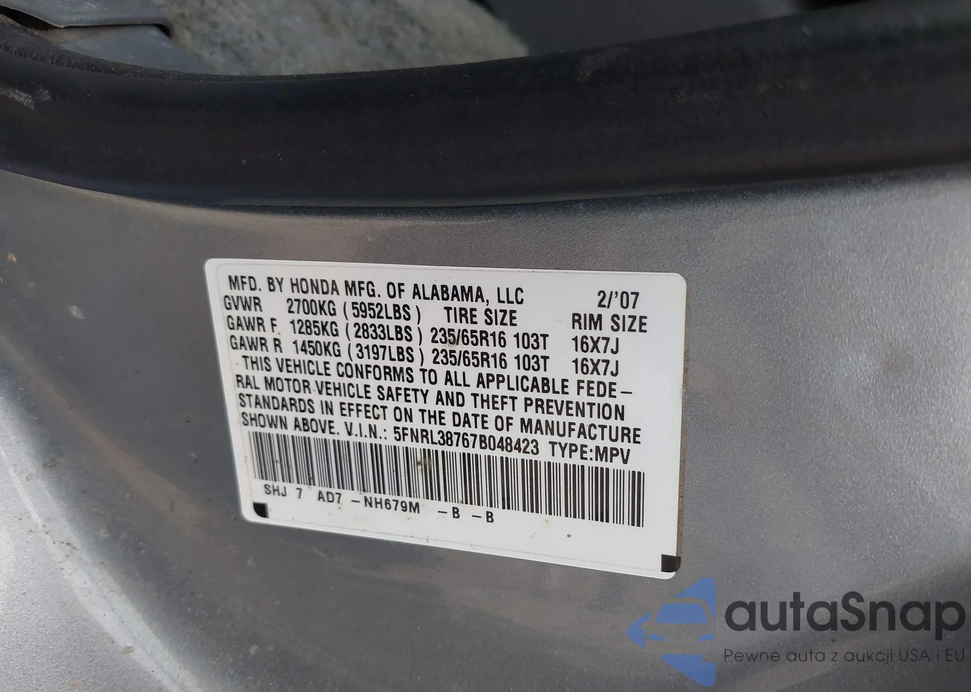 • VIN 5FNRL38767B048423
