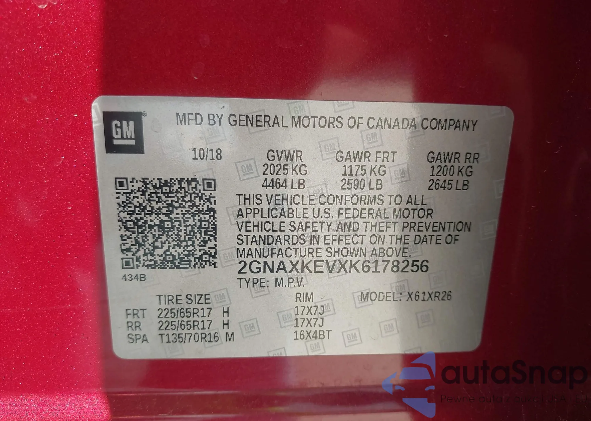 LOT: 42931097 VIN: 2GNAXKEVXK6178256