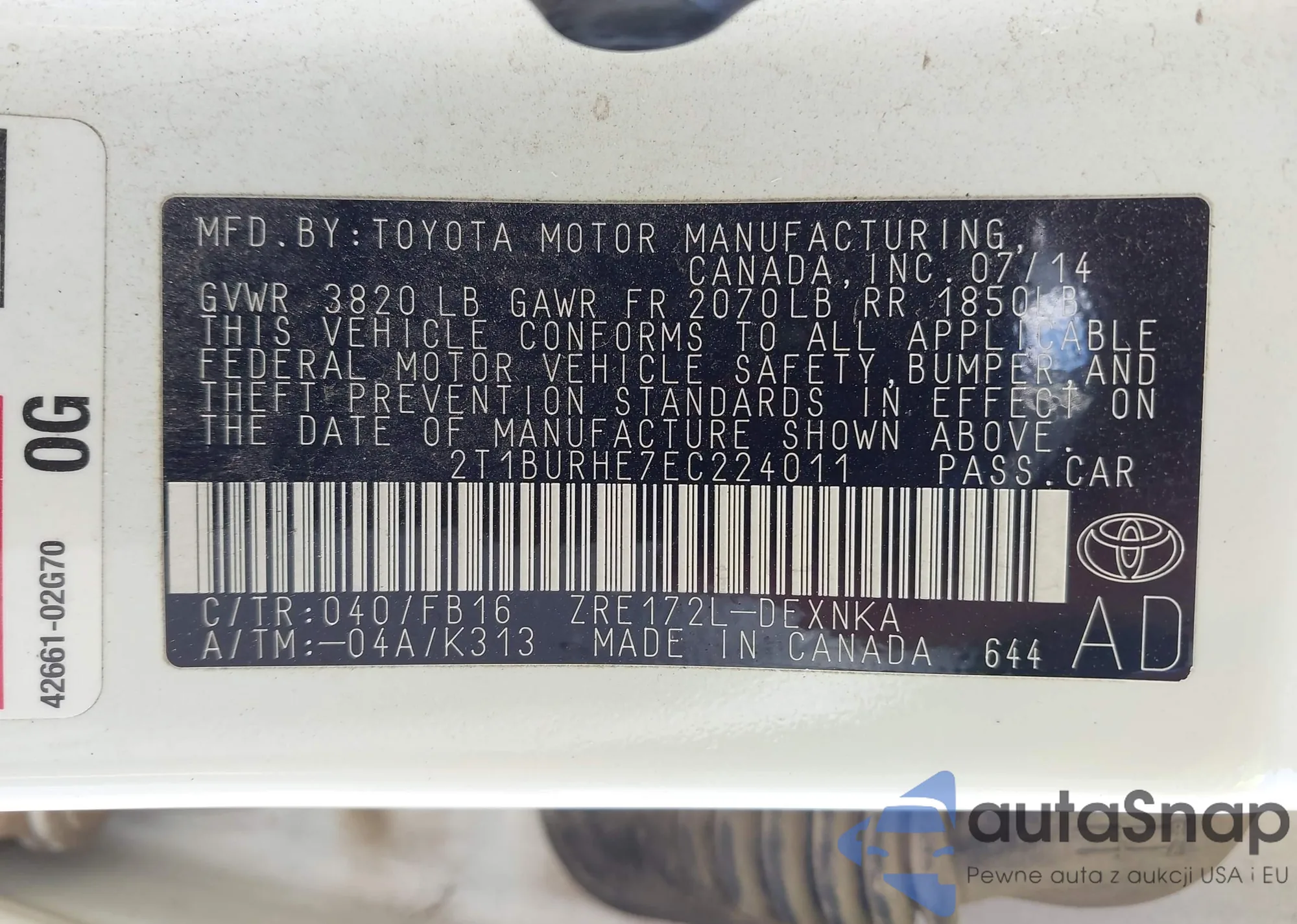LOT: 43021394 VIN: 2T1BURHE7EC224011