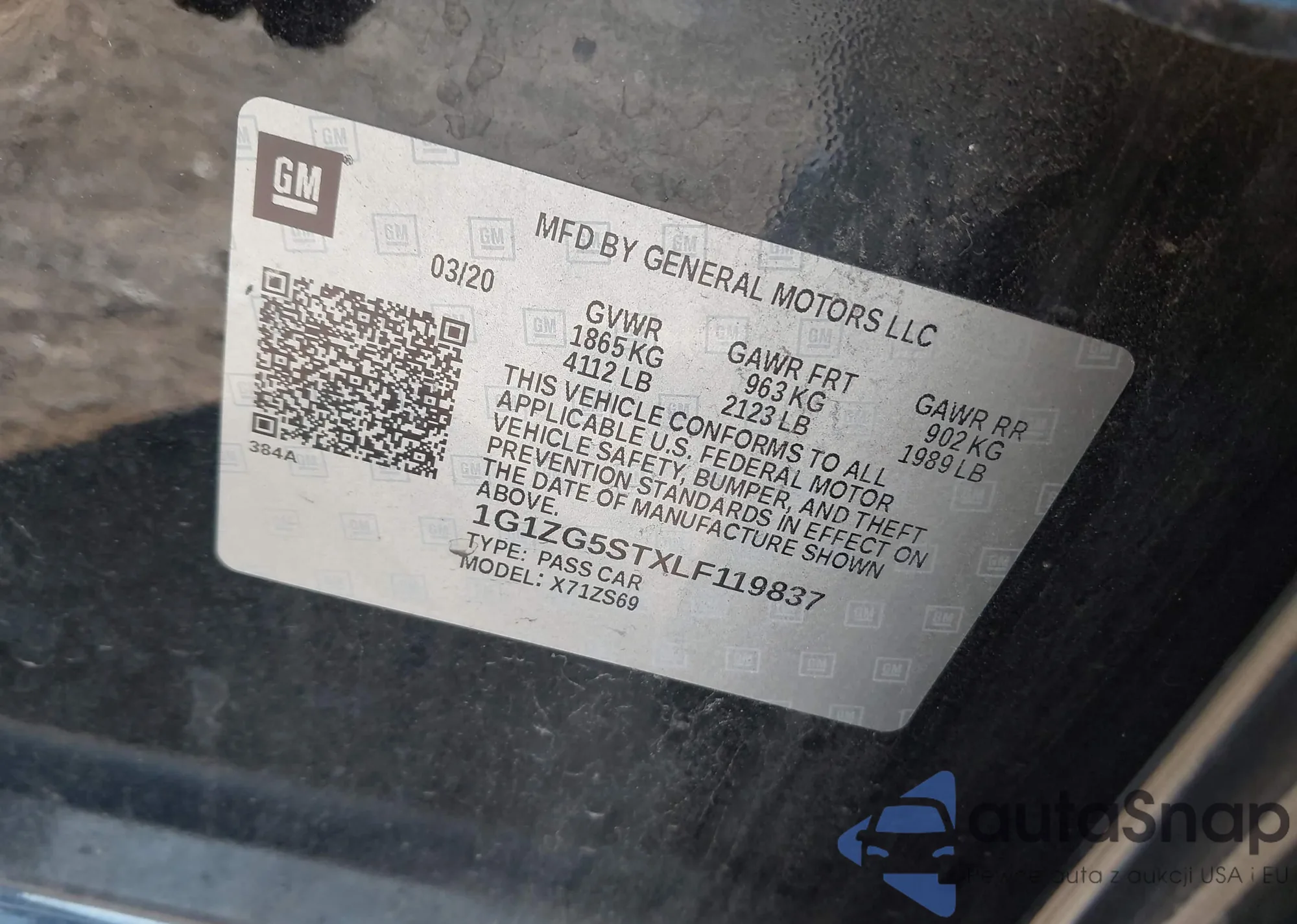 LOT: 43095897 VIN: 1G1ZG5STXLF119837