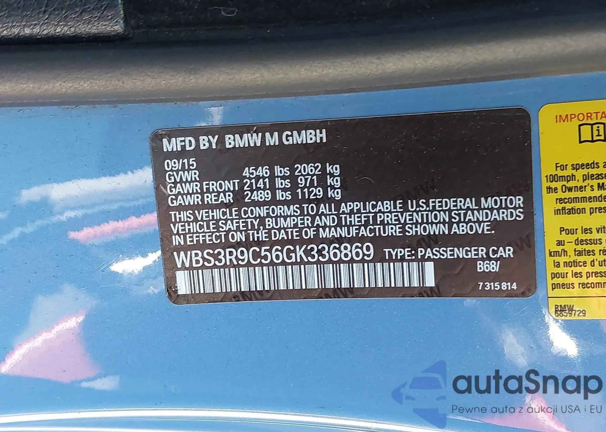 LOT: 43220438 VIN: WBS3R9C56GK336869