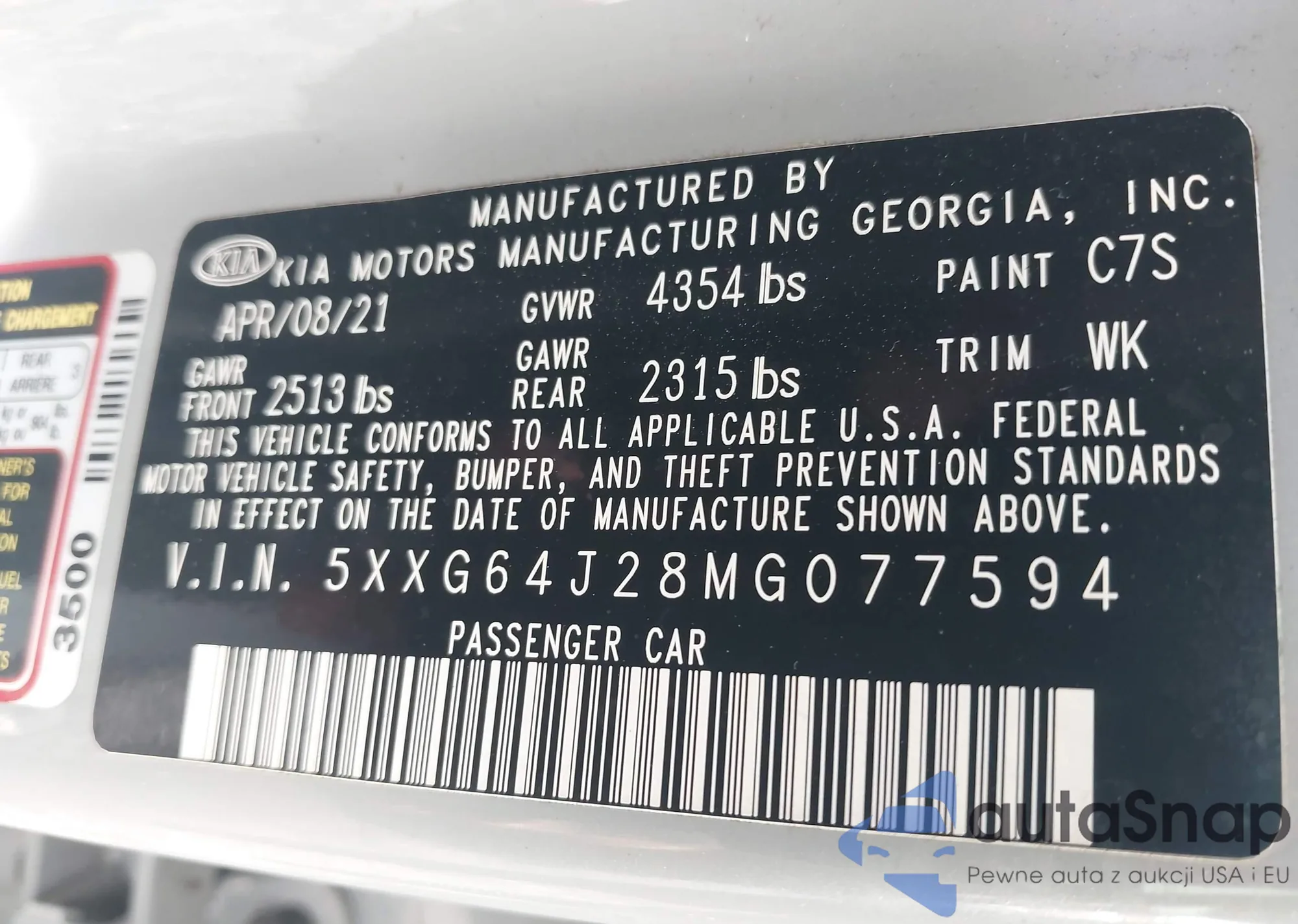 LOT: 43036536 VIN: 5XXG64J28MG077594