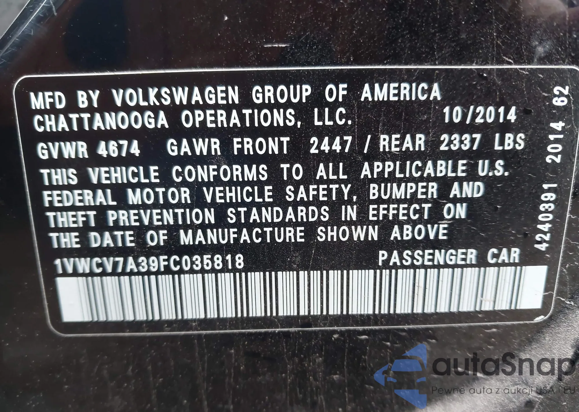 LOT: 43092585 VIN: 1VWCV7A39FC035818