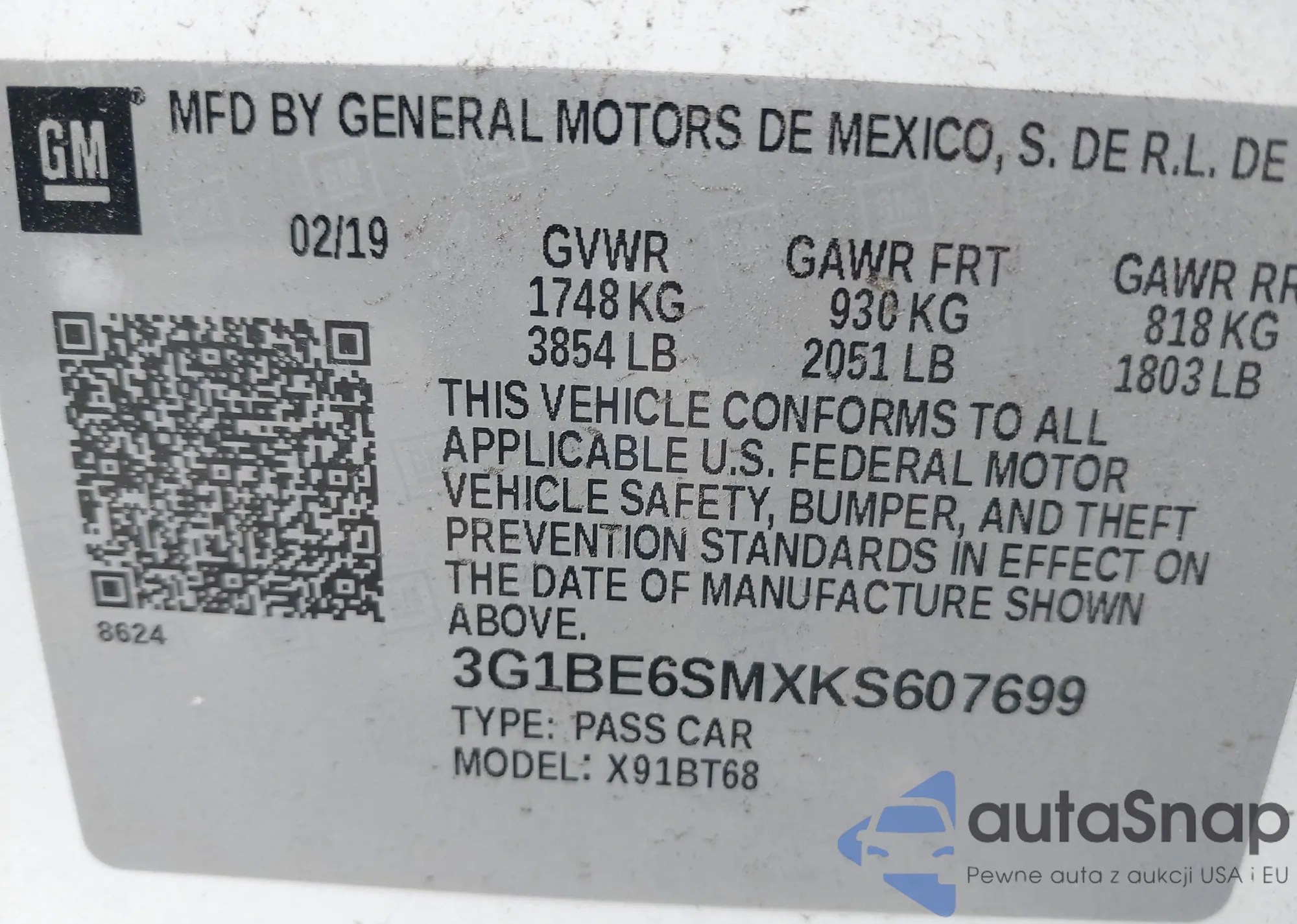 • VIN 3G1BE6SMXKS607699