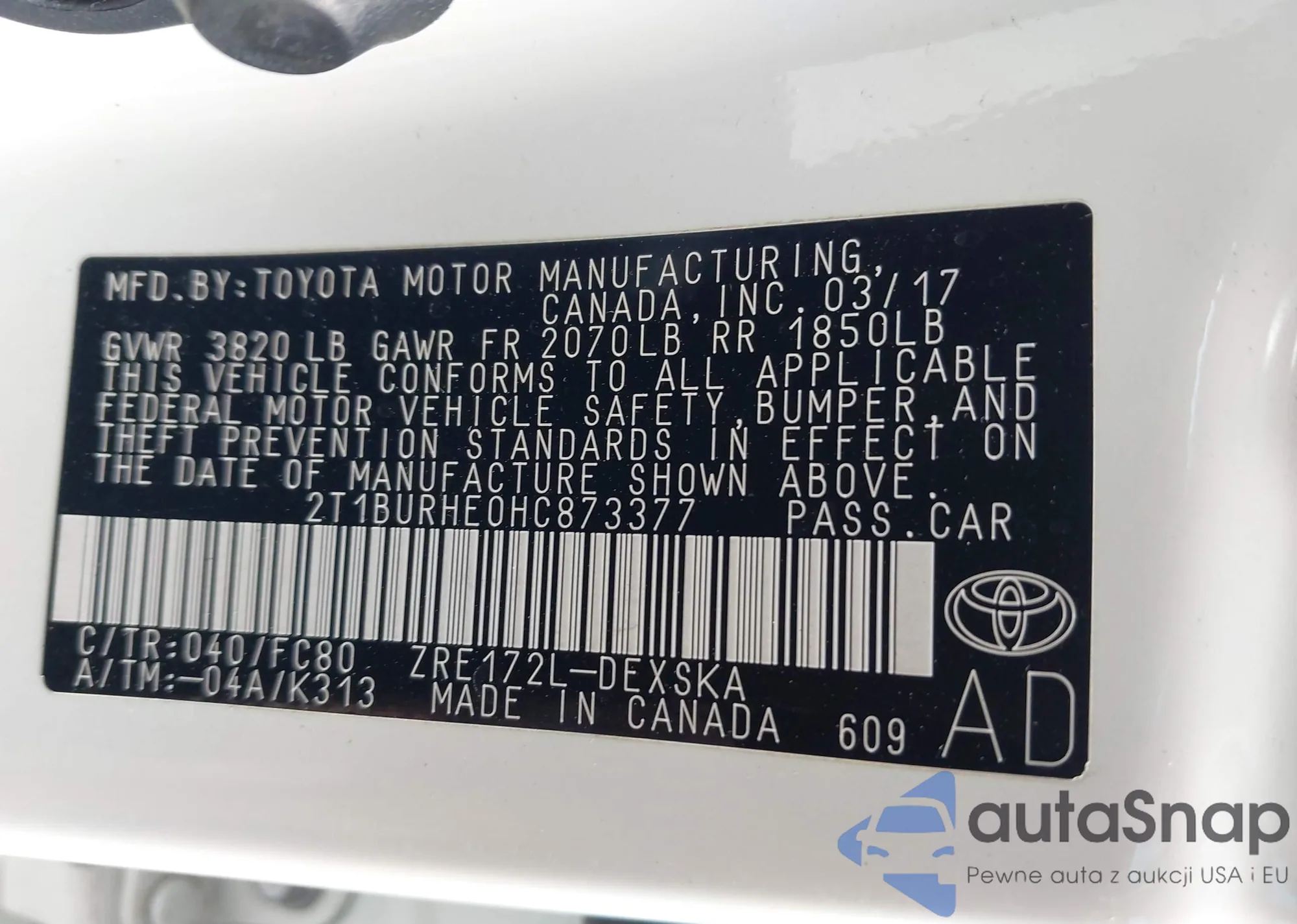 LOT: 43187378 VIN: 2T1BURHE0HC873377