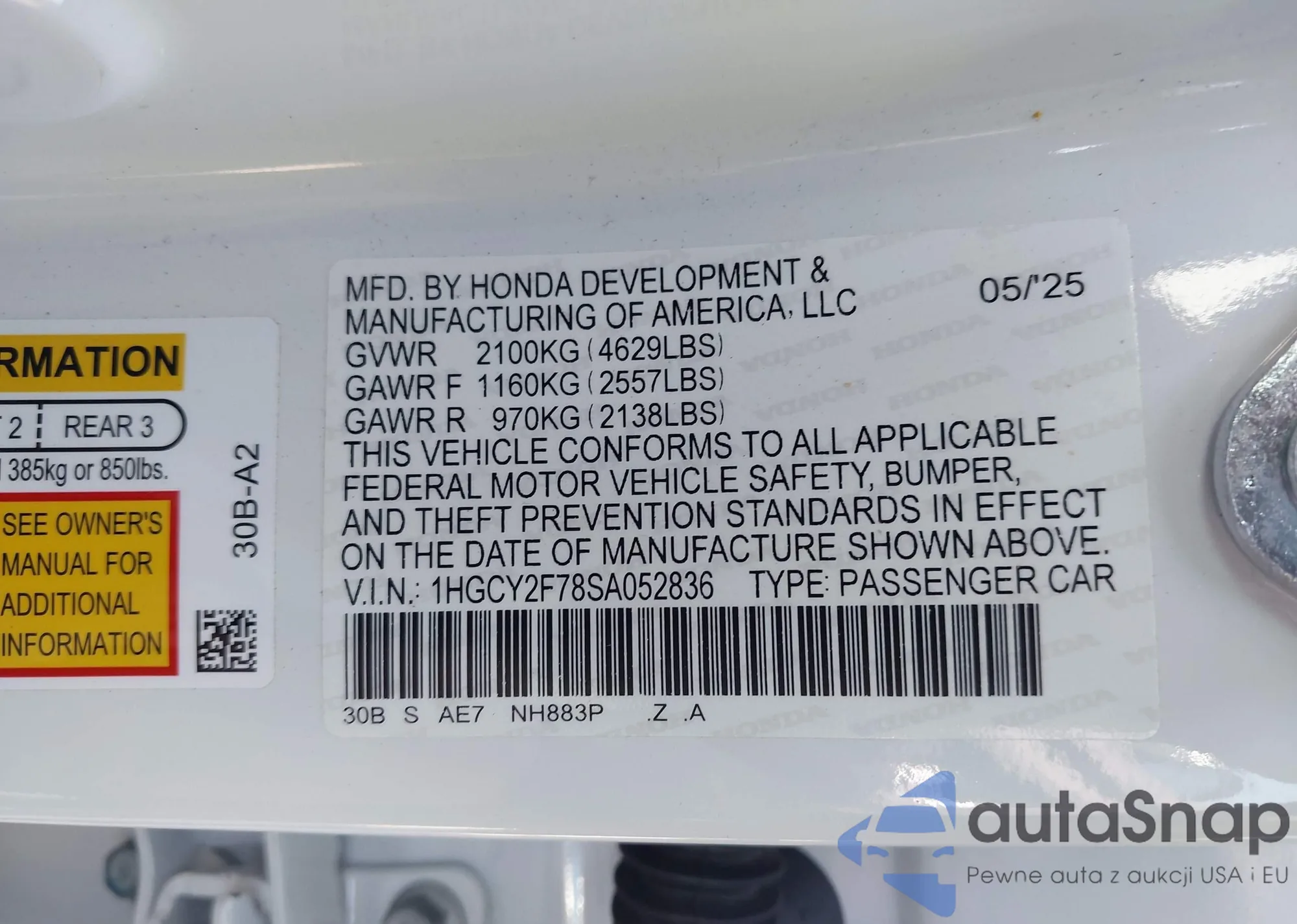 • VIN 1HGCY2F78SA052836