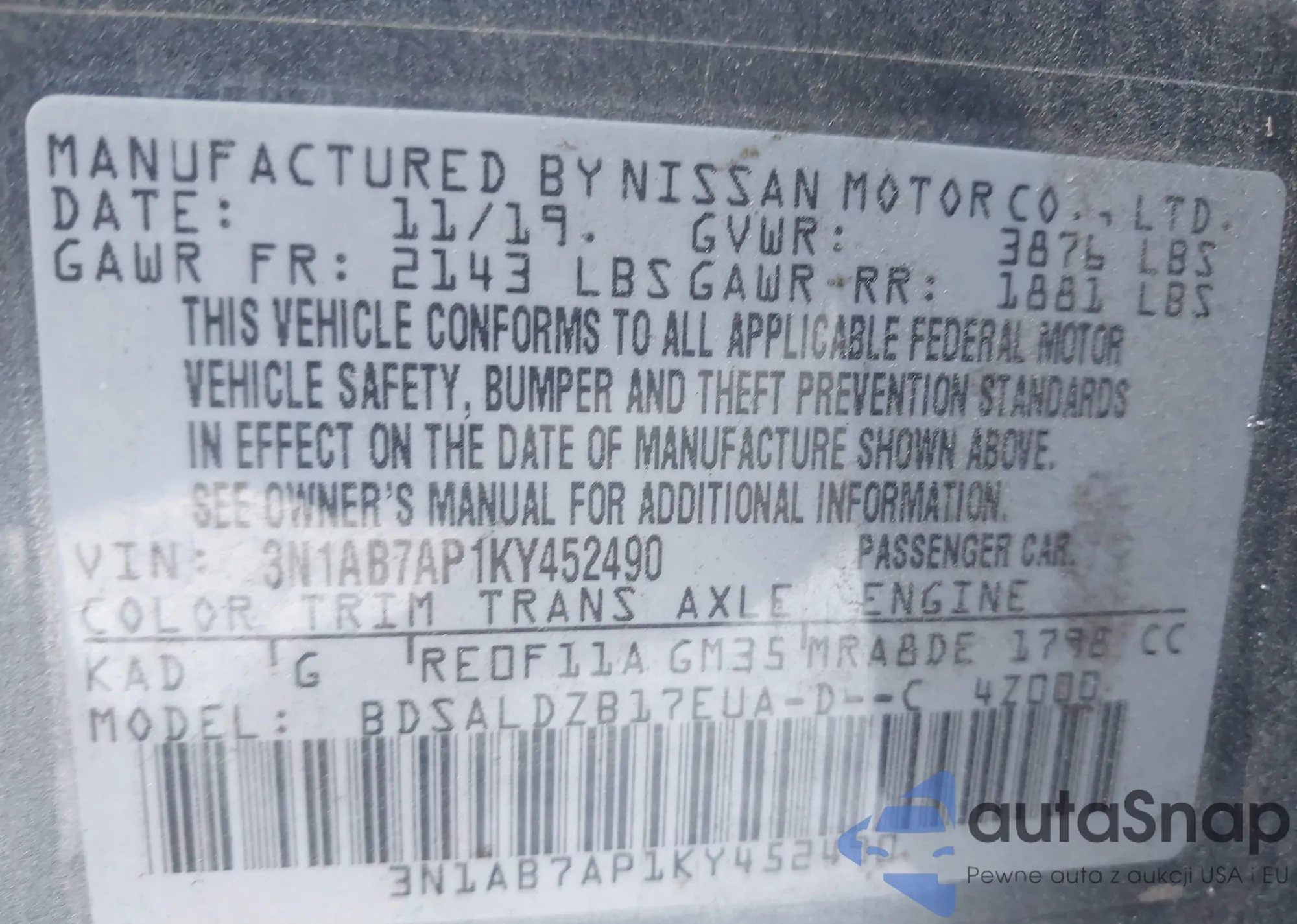 • VIN 3N1AB7AP1KY452490