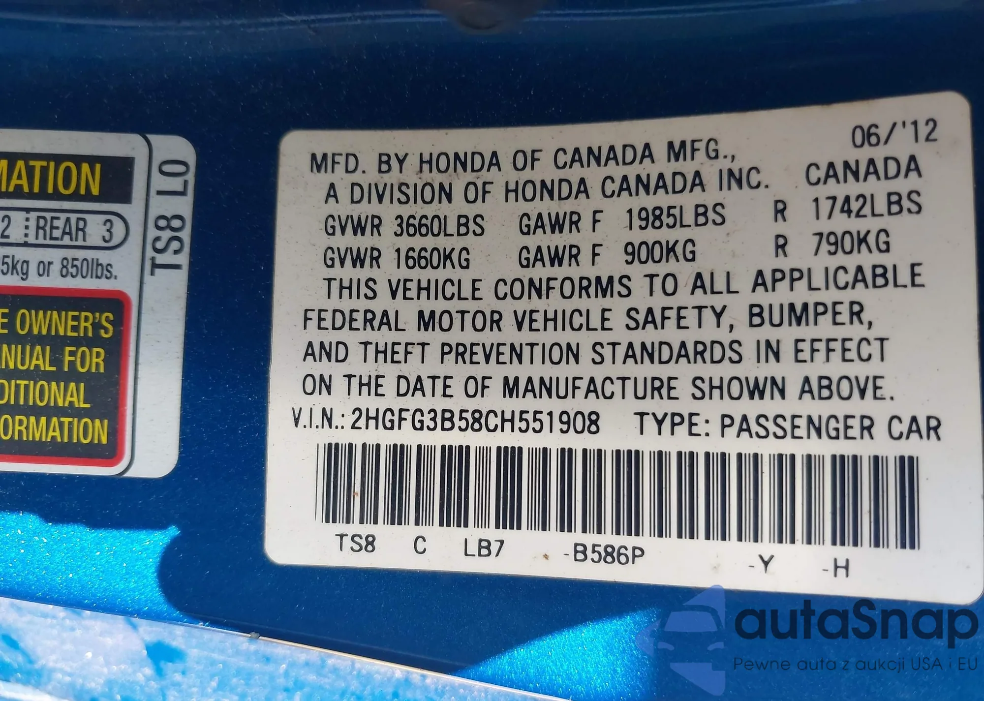 • VIN 2HGFG3B58CH551908