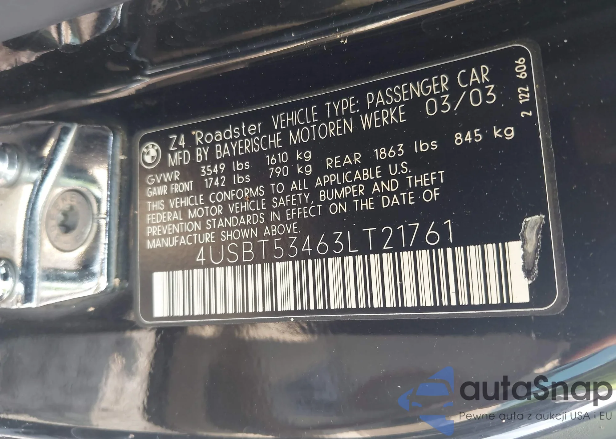 2003 BMW Z4 3.0I из США, поврежденный, VIN 4USBT53463LT21761