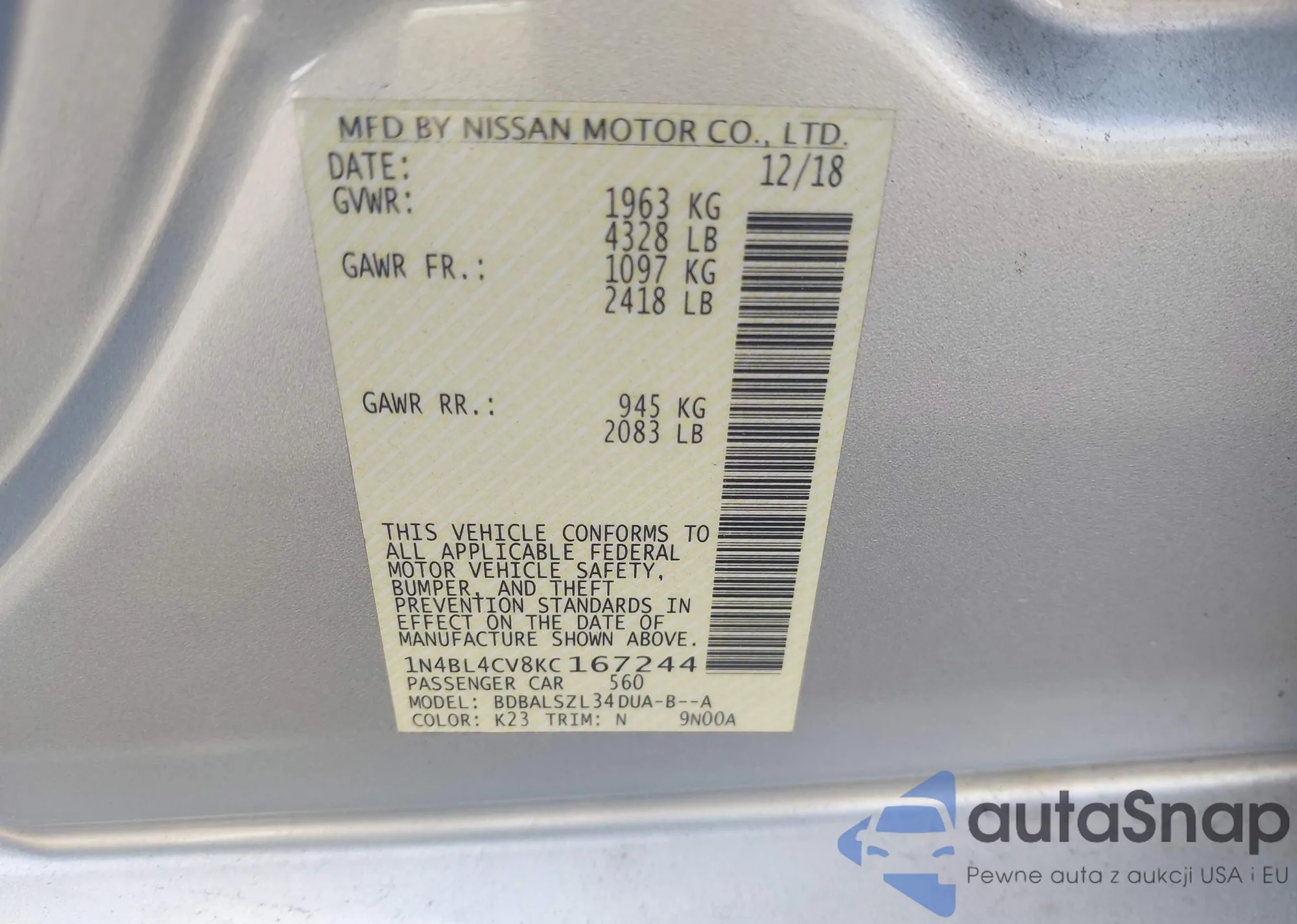 LOT: 42974932 VIN: 1N4BL4CV8KC167244