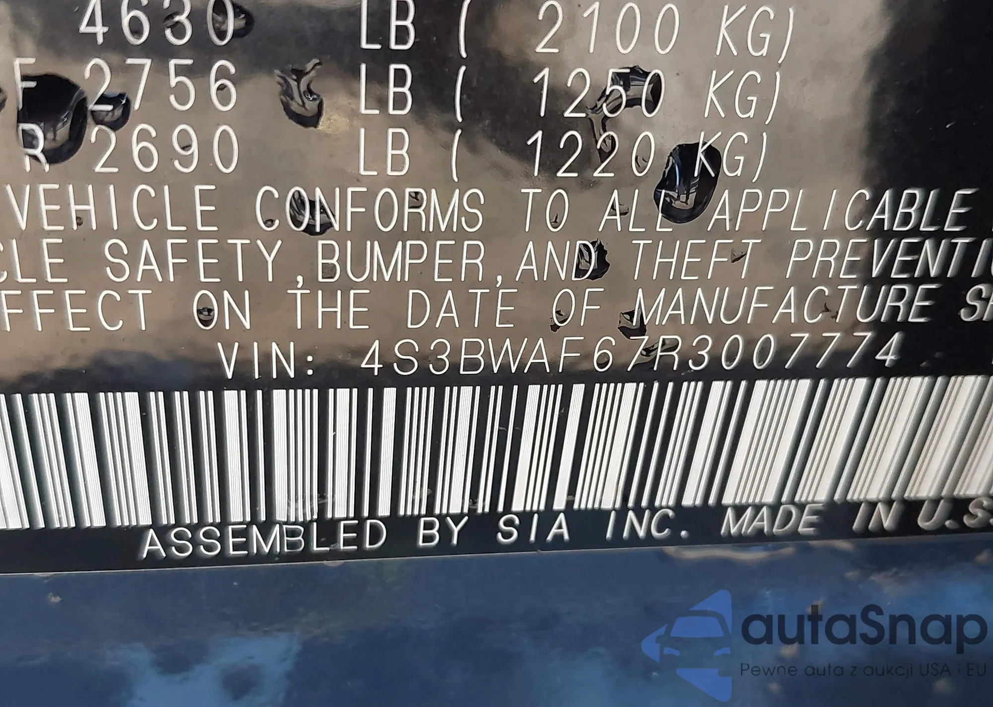 • VIN 4S3BWAF67R3007774