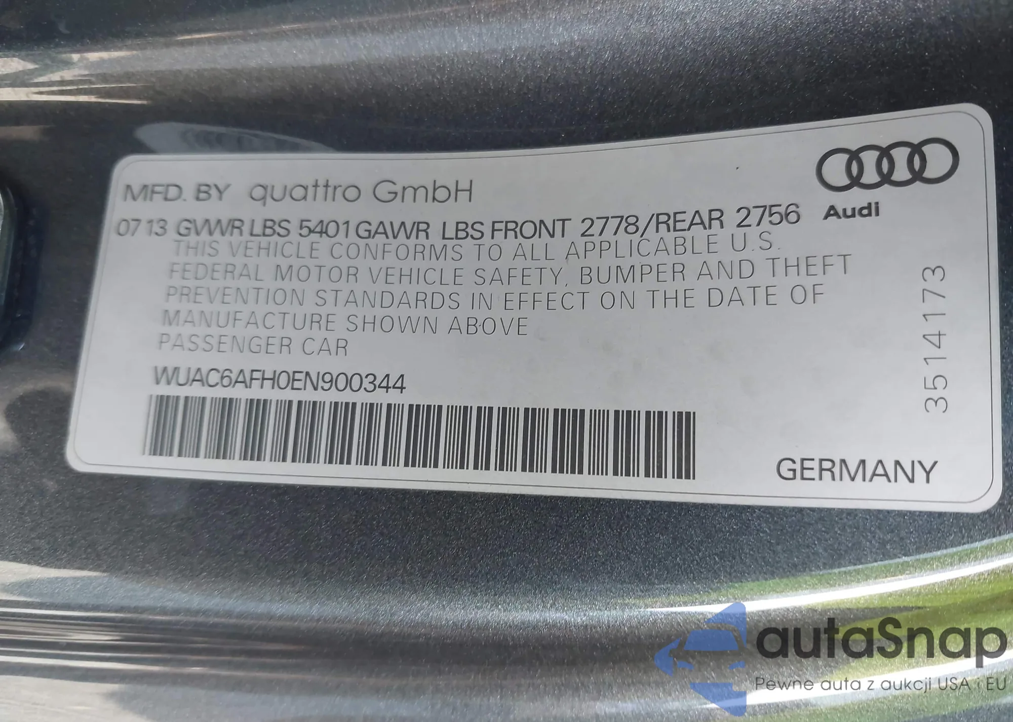 LOT: 42919553 VIN: WUAC6AFH0EN900344