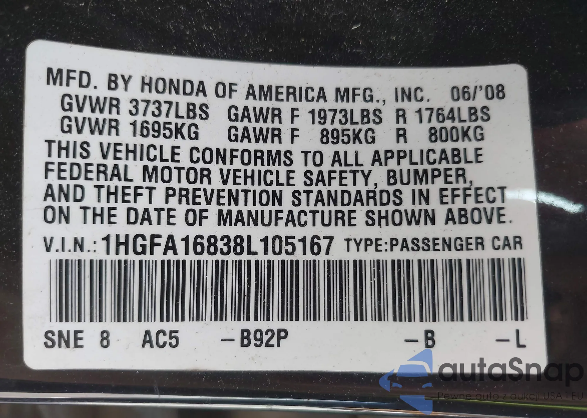 LOT: 43108907 VIN: 1HGFA16838L105167