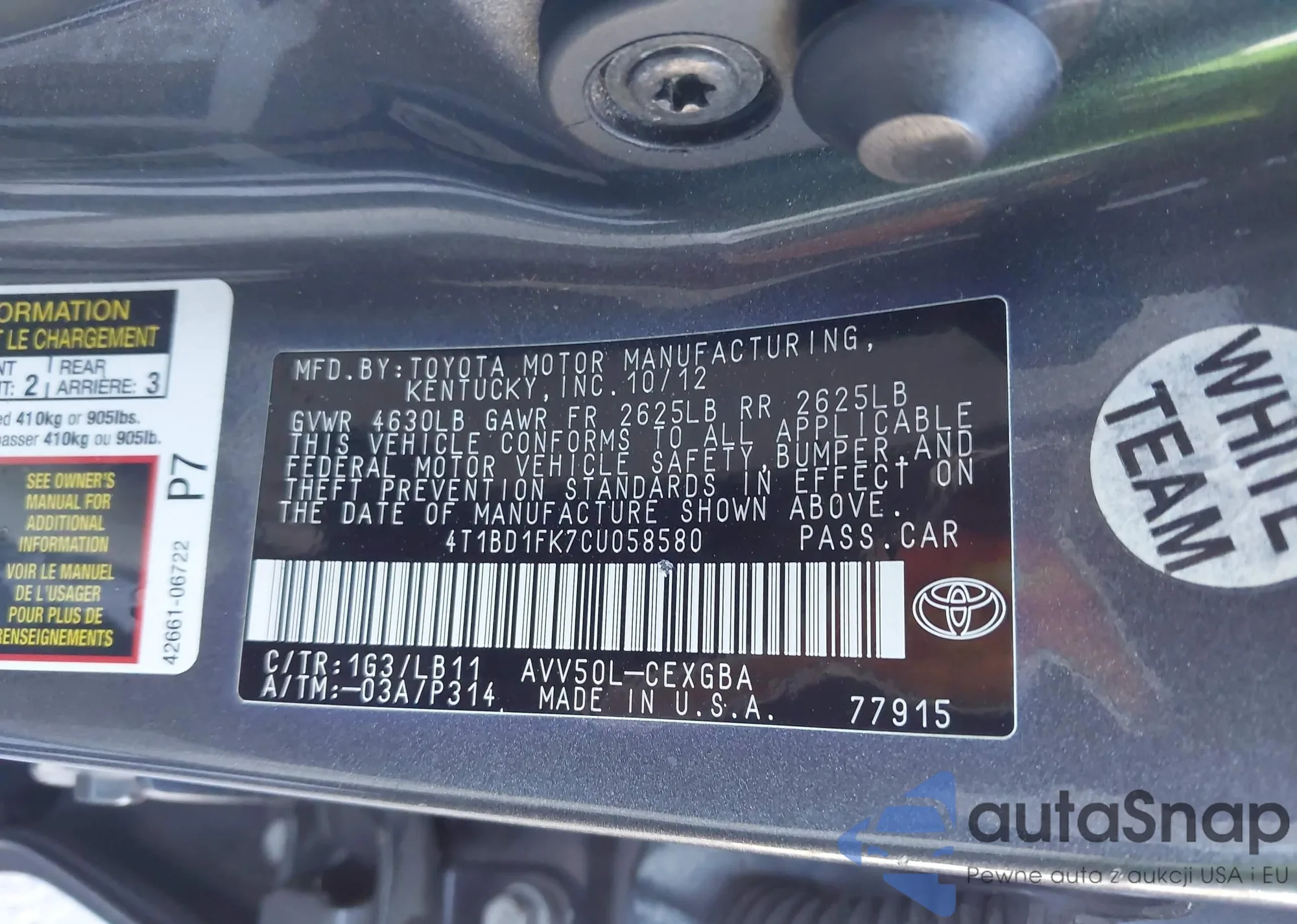 • VIN 4T1BD1FK7CU058580