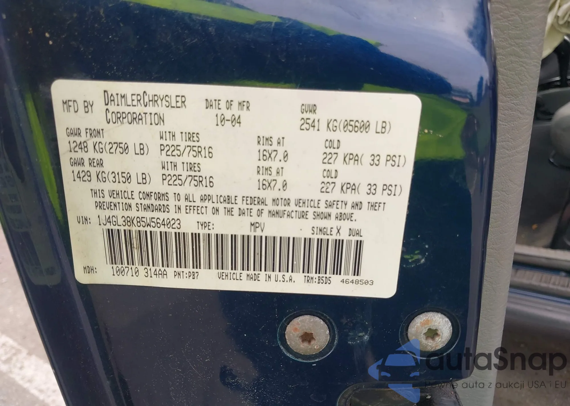 • VIN 1J4GL38K85W564023