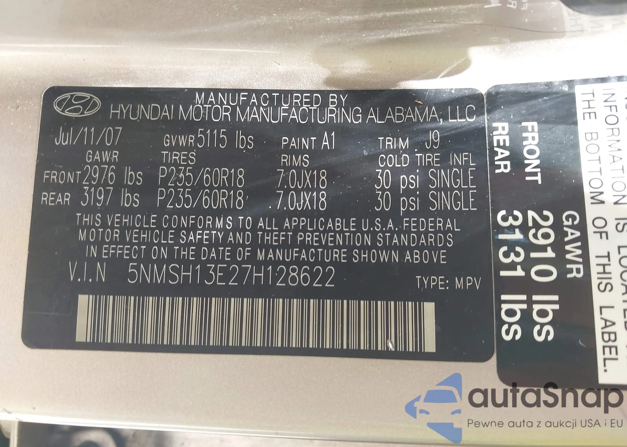 LOT: 43003043 VIN: 5NMSH13E27H128622