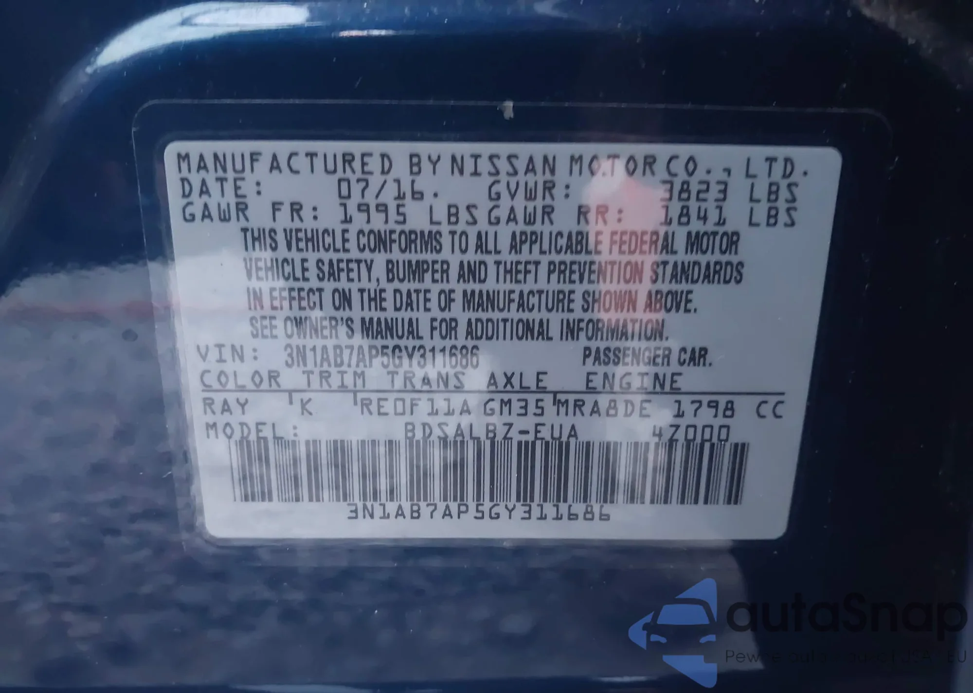 LOT: 43219127 VIN: 3N1AB7AP5GY311686