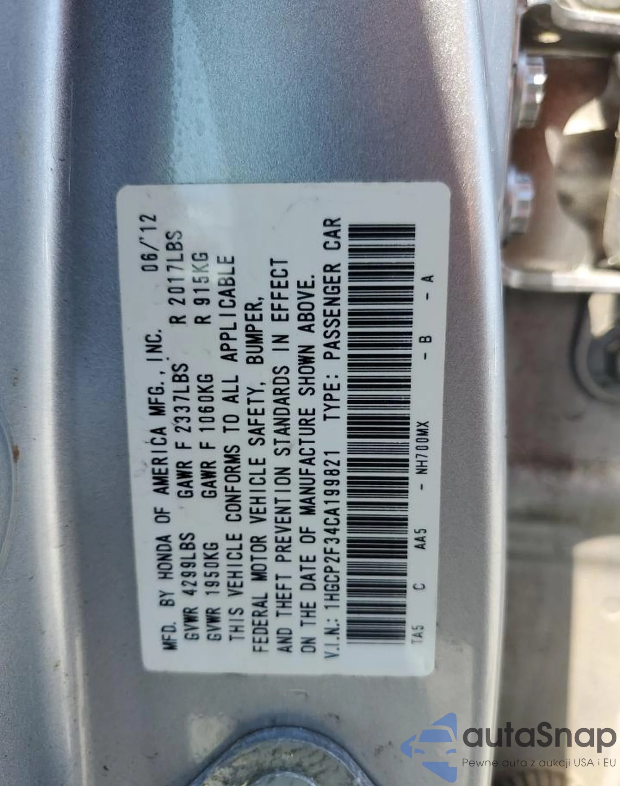LOT: 70247775 VIN: 1HGCP2F34CA199821