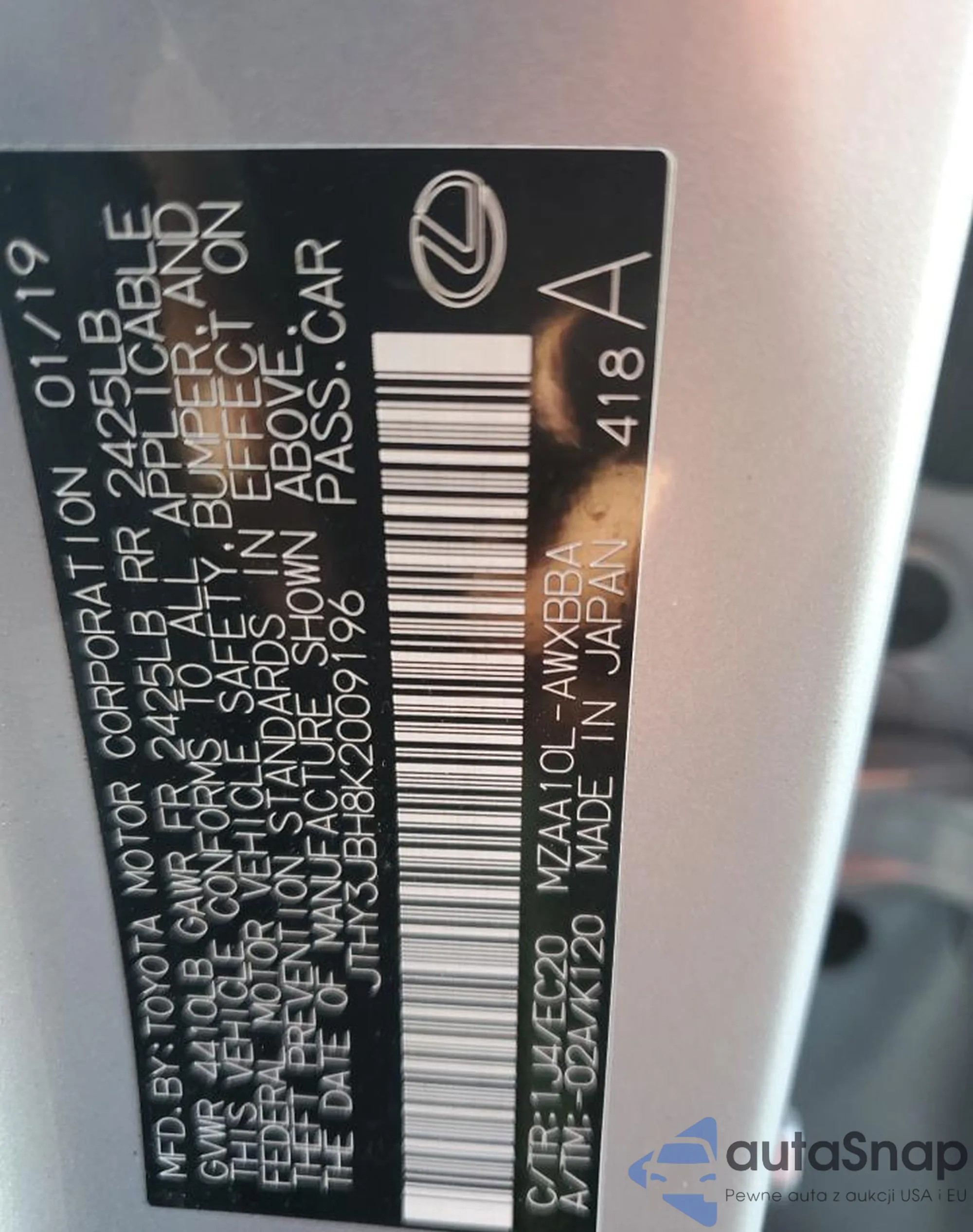 LOT: 71202995 VIN: JTHY3JBH8K2009196