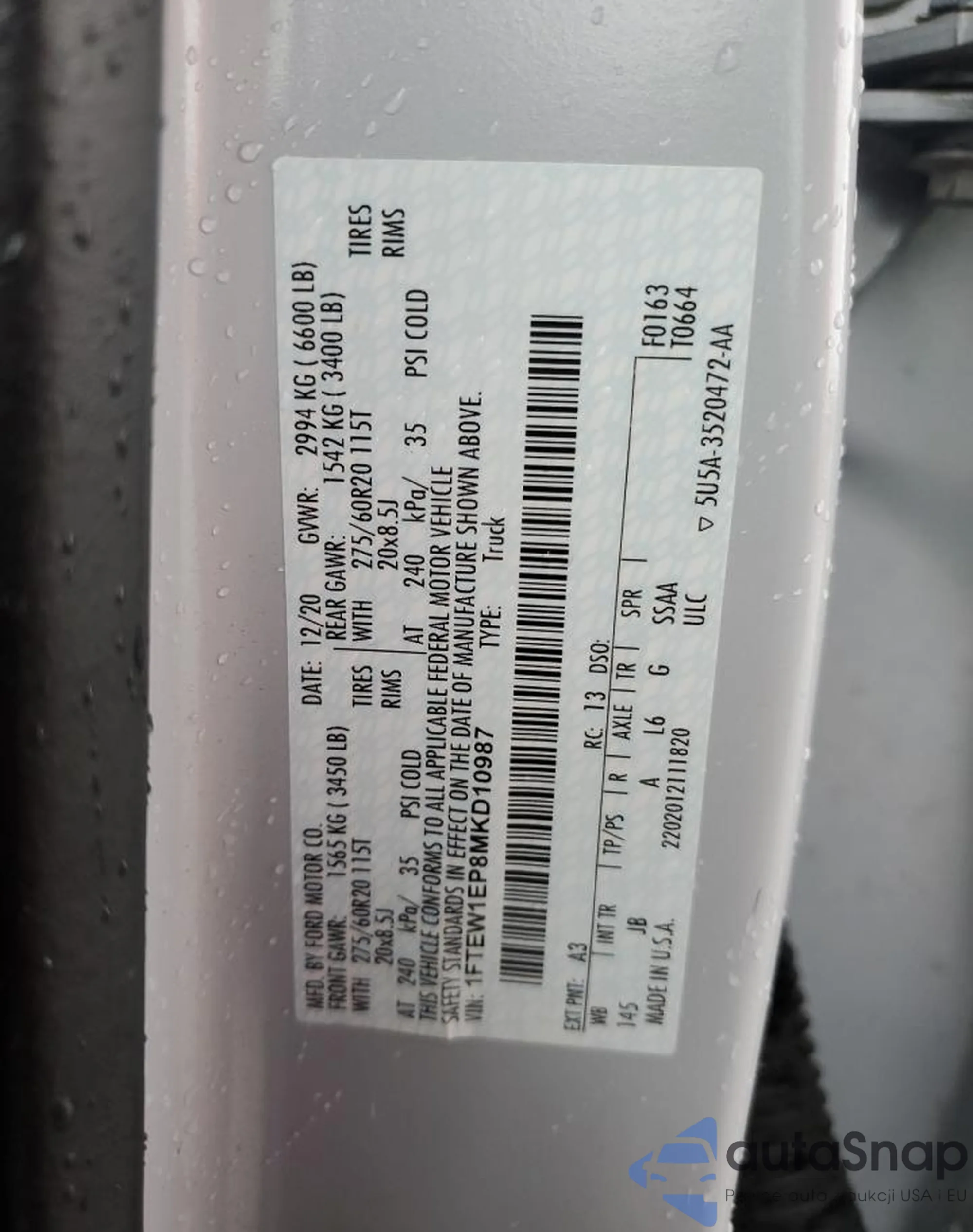 LOT: 69791795 VIN: 1FTEW1EP8MKD10987