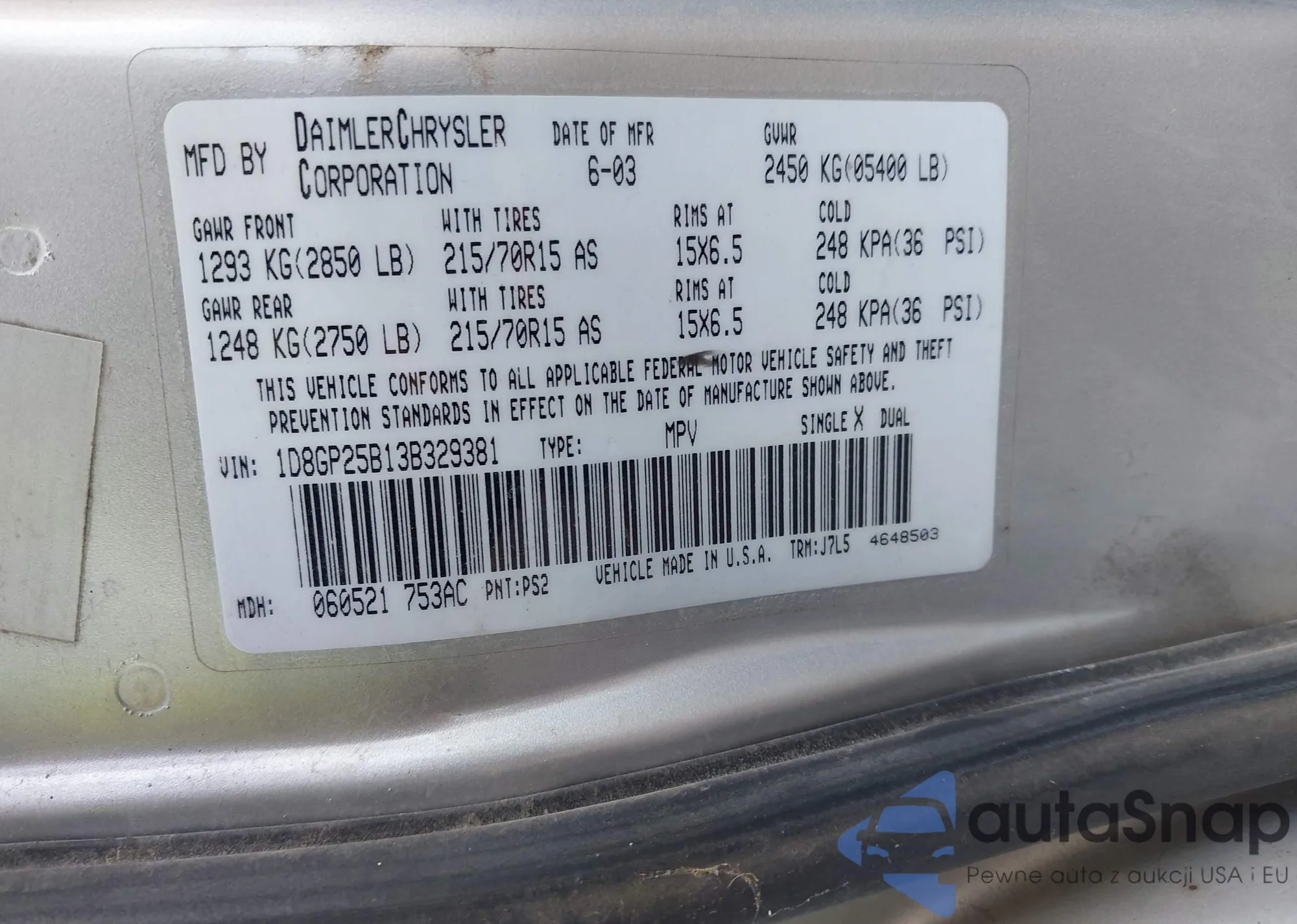 LOT: 43084315 VIN: 1D8GP25B13B329381