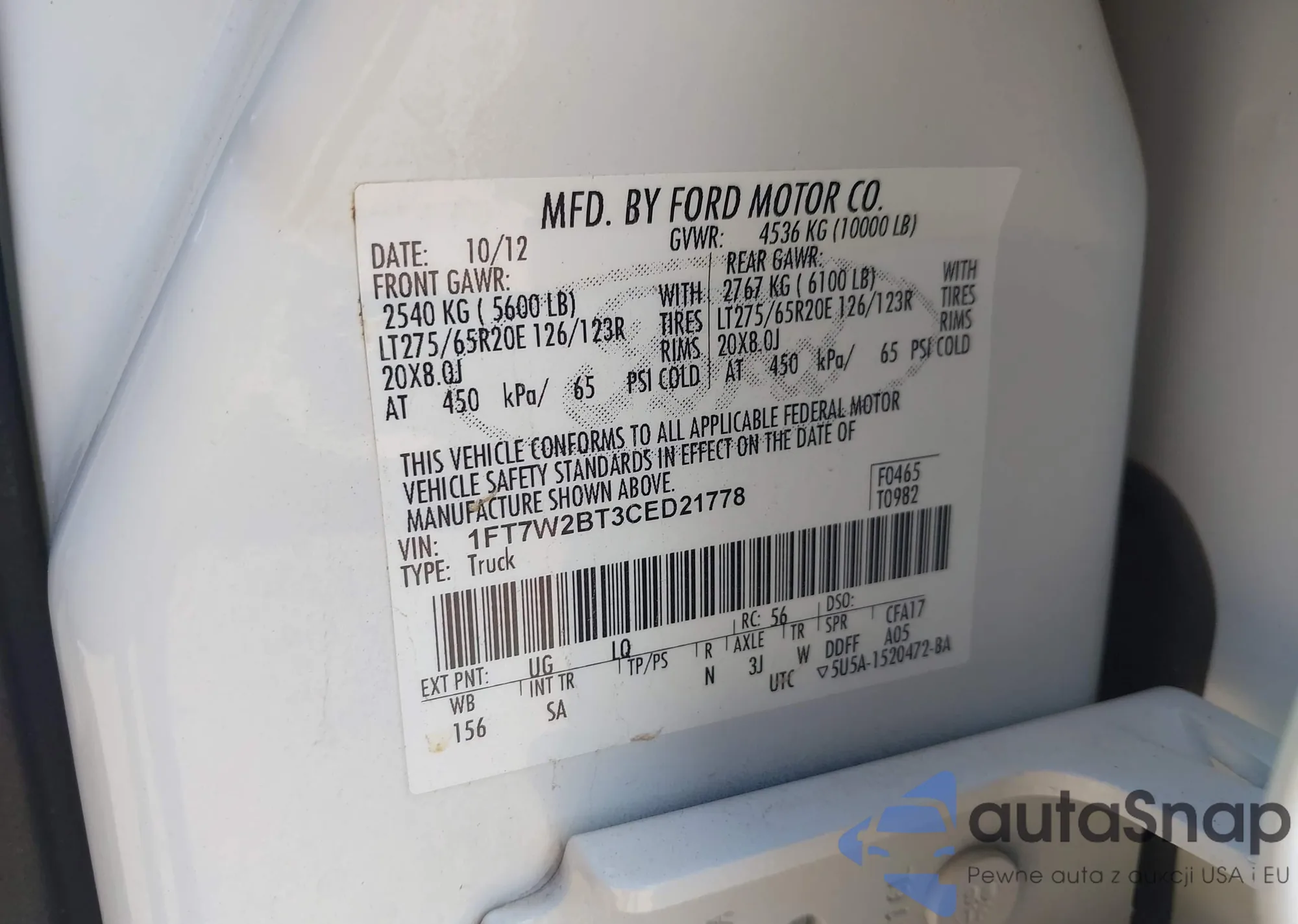 LOT: 43106678 VIN: 1FT7W2BT3CED21778
