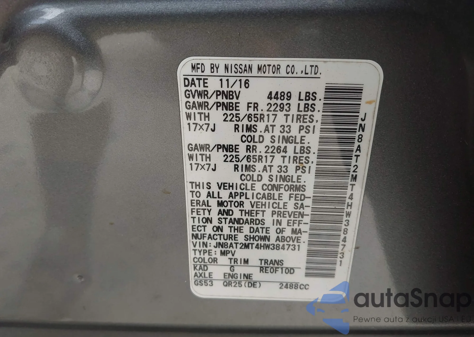 LOT: 42938499 VIN: JN8AT2MT4HW384731