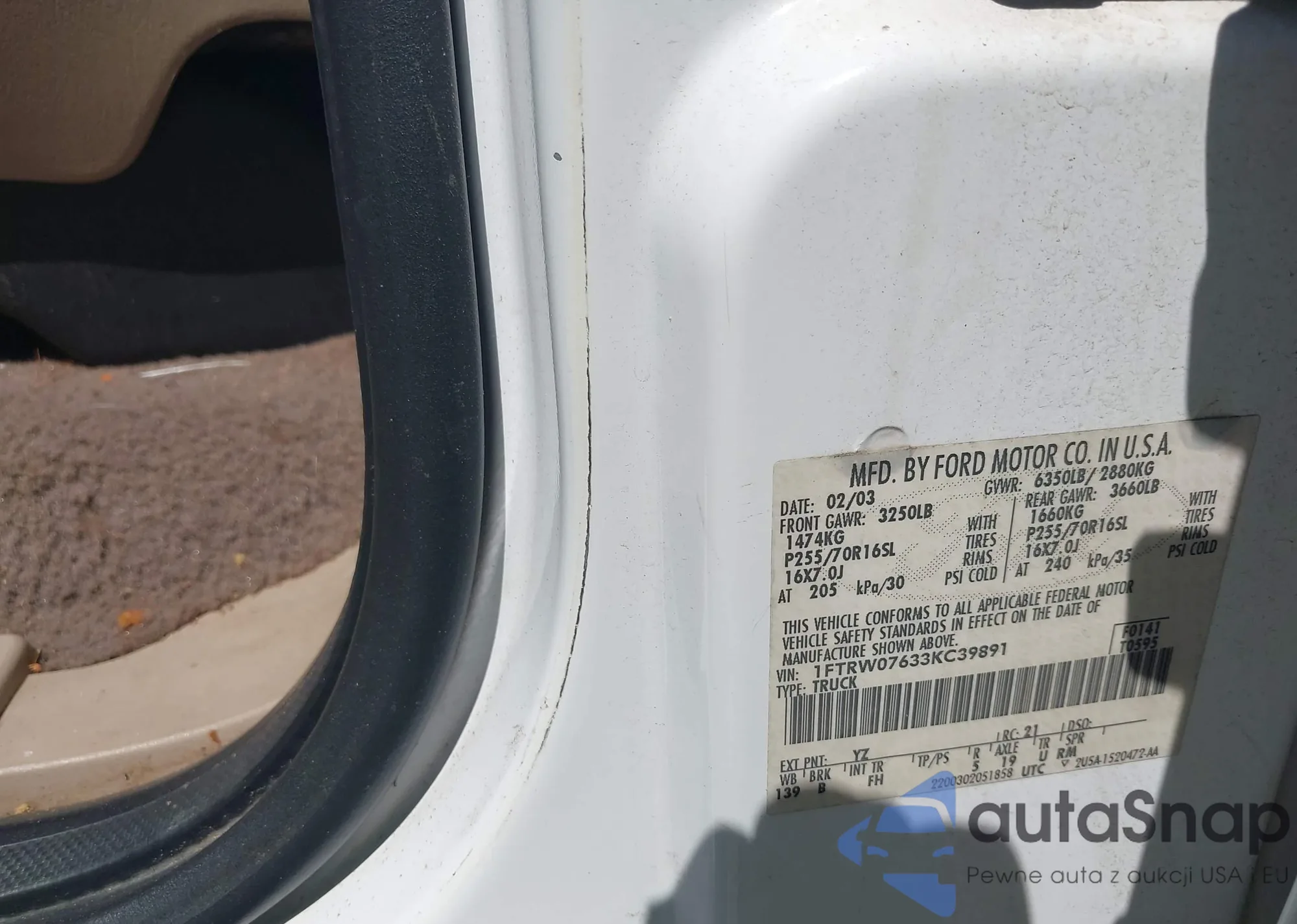 LOT: 43013157 VIN: 1FTRW07633KC39891