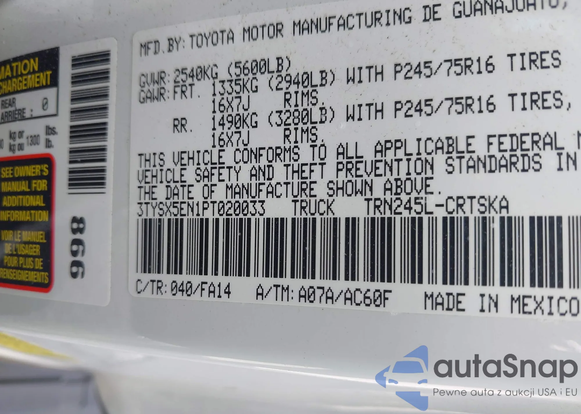 • VIN 3TYSX5EN1PT020033