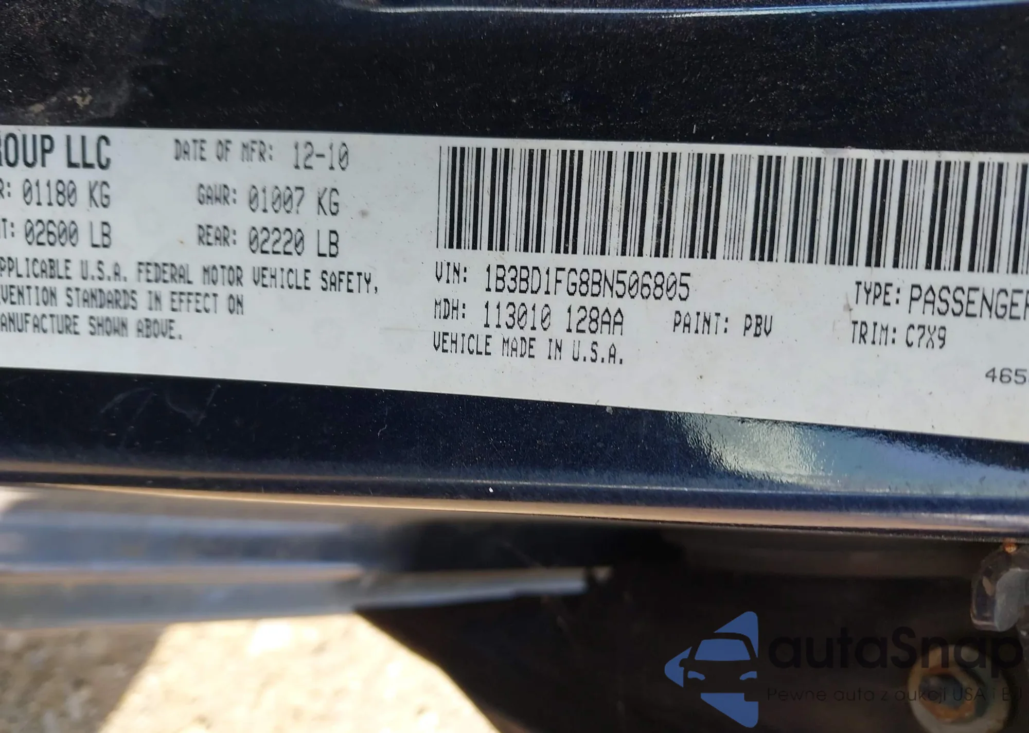 LOT: 43184453 VIN: 1B3BD1FG8BN506805