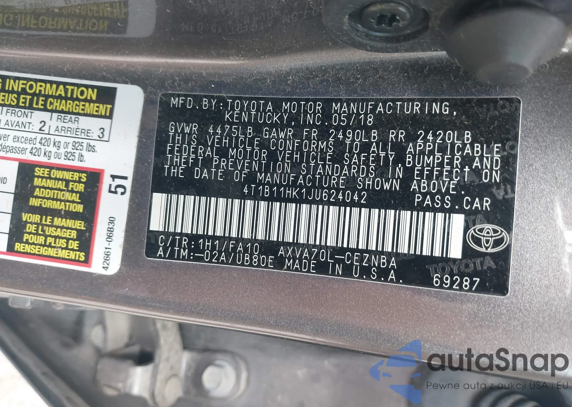 LOT: 42751779 VIN: 4T1B11HK1JU624042