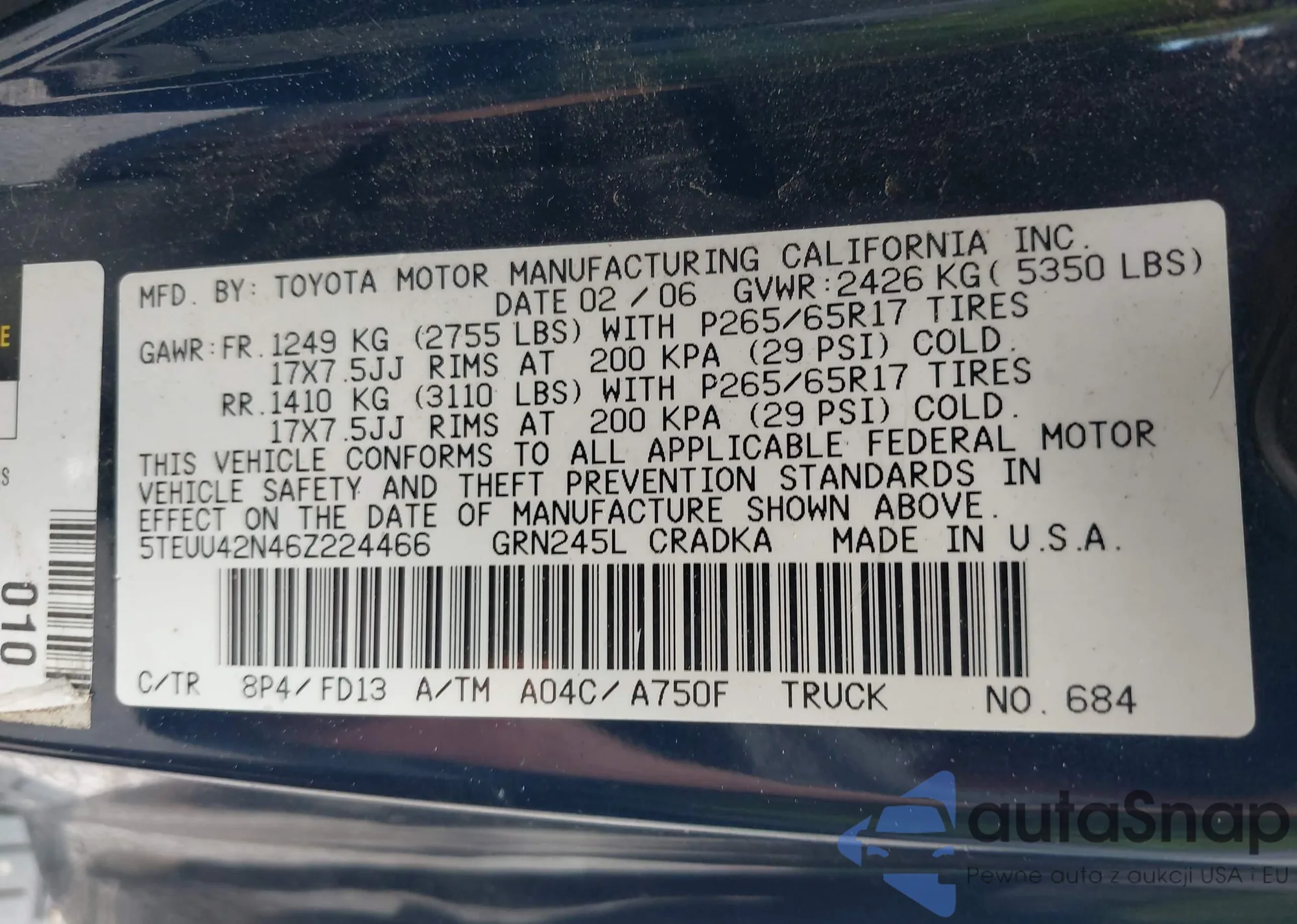 LOT: 42989003 VIN: 5TEUU42N46Z224466