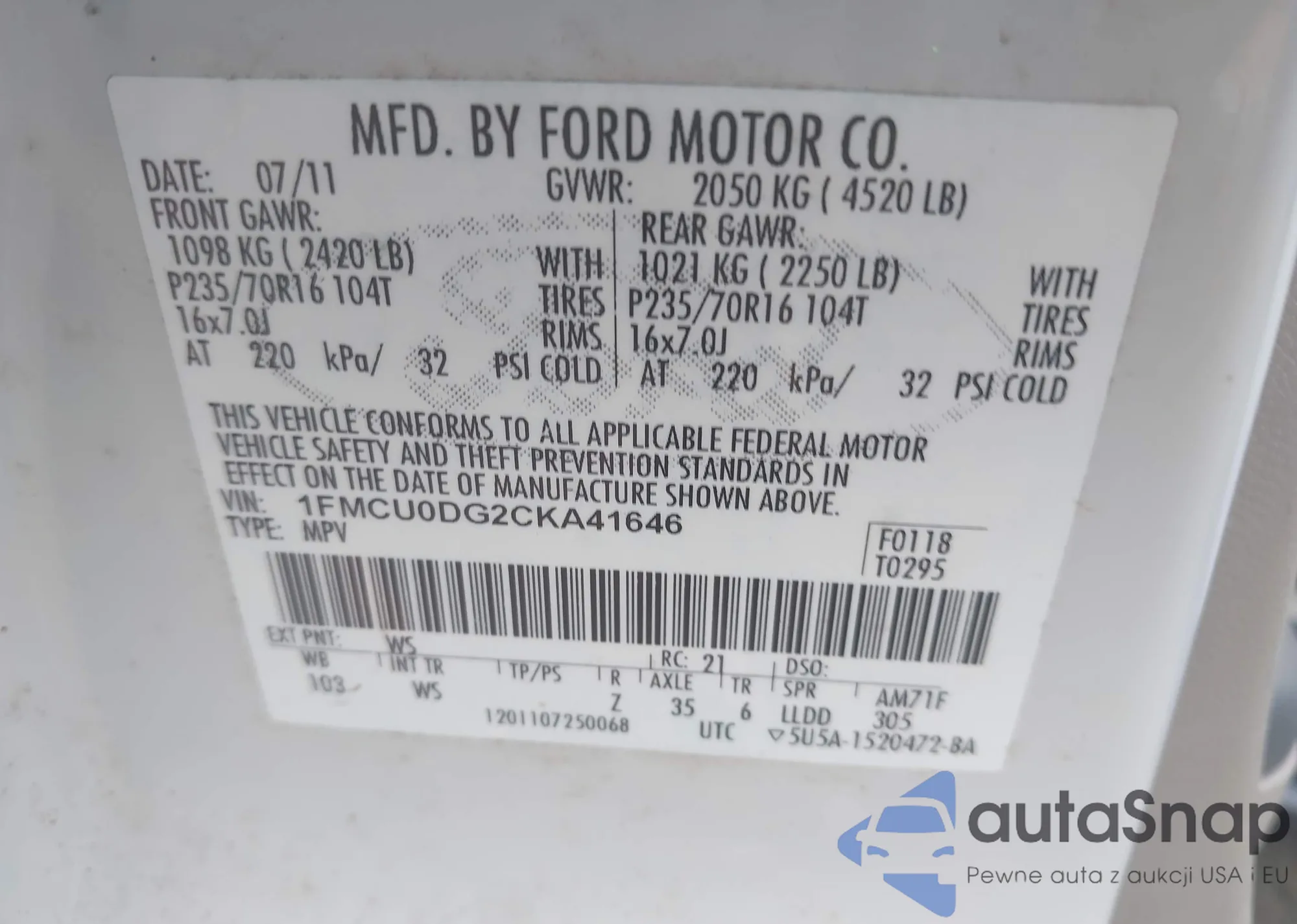 • VIN 1FMCU0DG2CKA41646