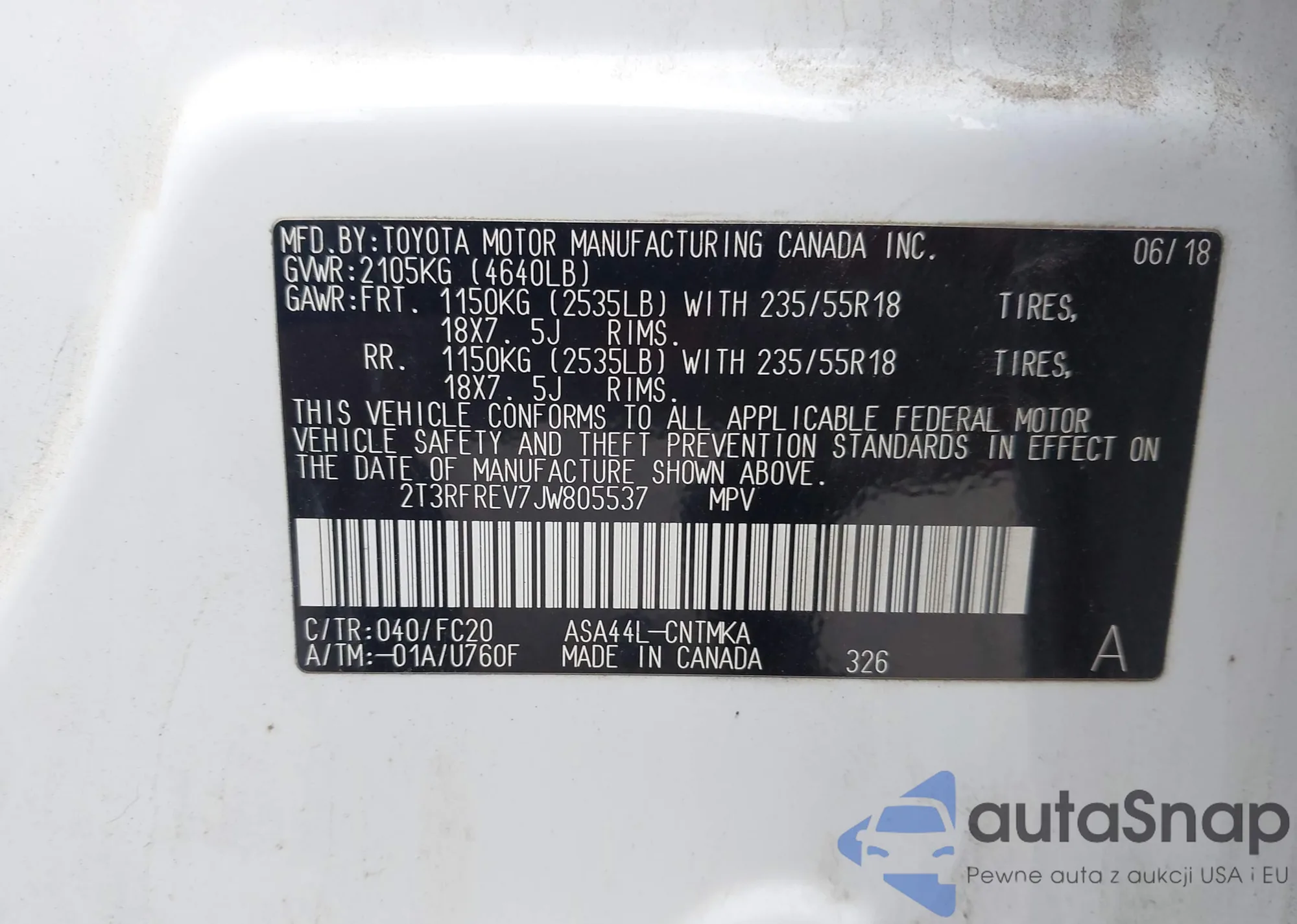 LOT: 42681471 VIN: 2T3RFREV7JW805537