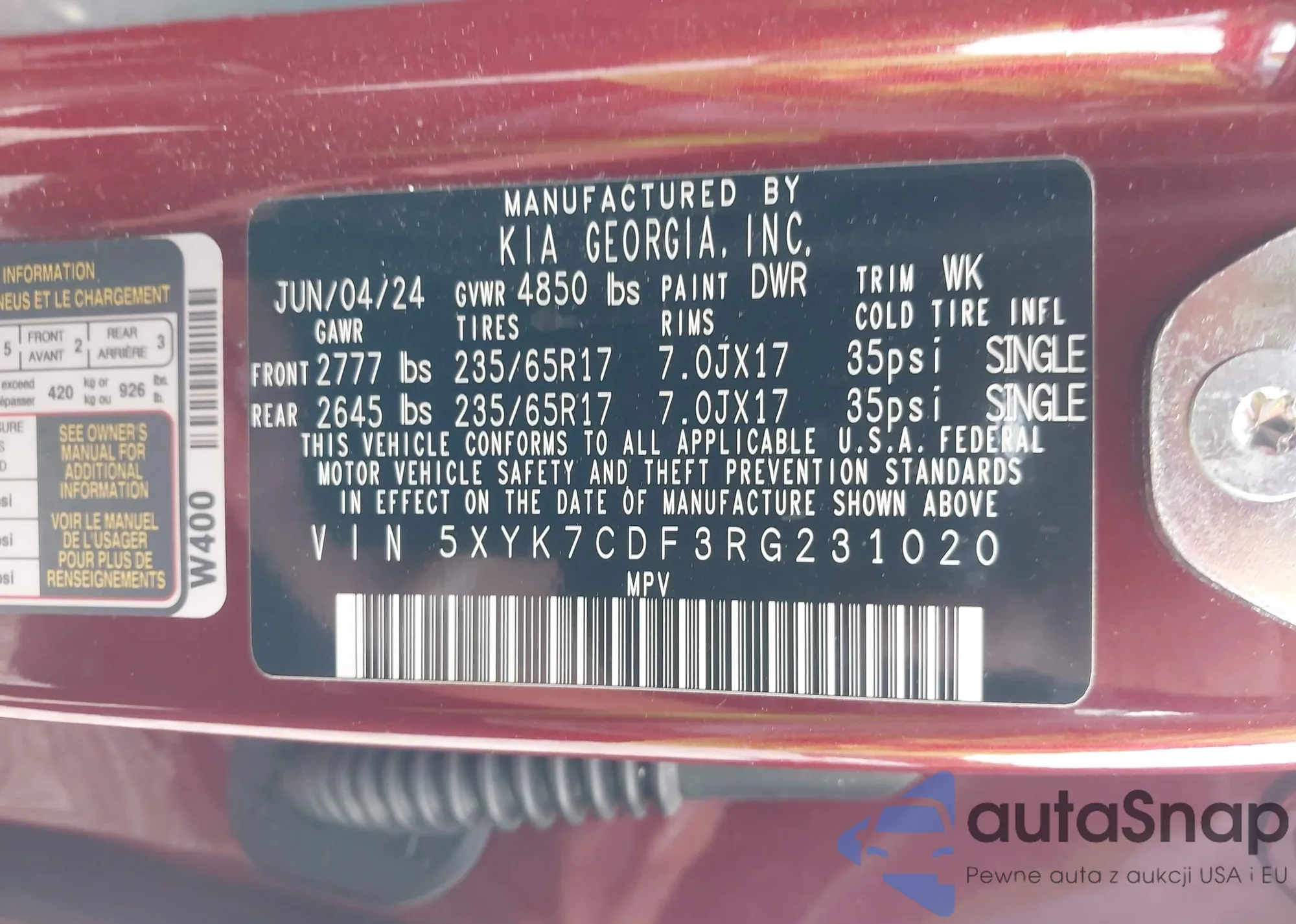 LOT: 42812925 VIN: KNDC34LA1R5201907