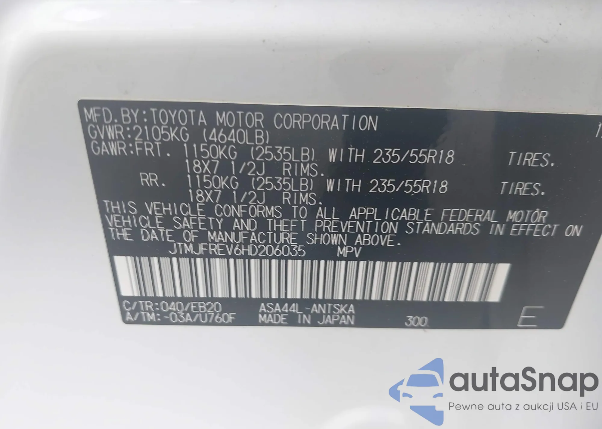 LOT: 43320502 VIN: JTMJFREV6HD206035