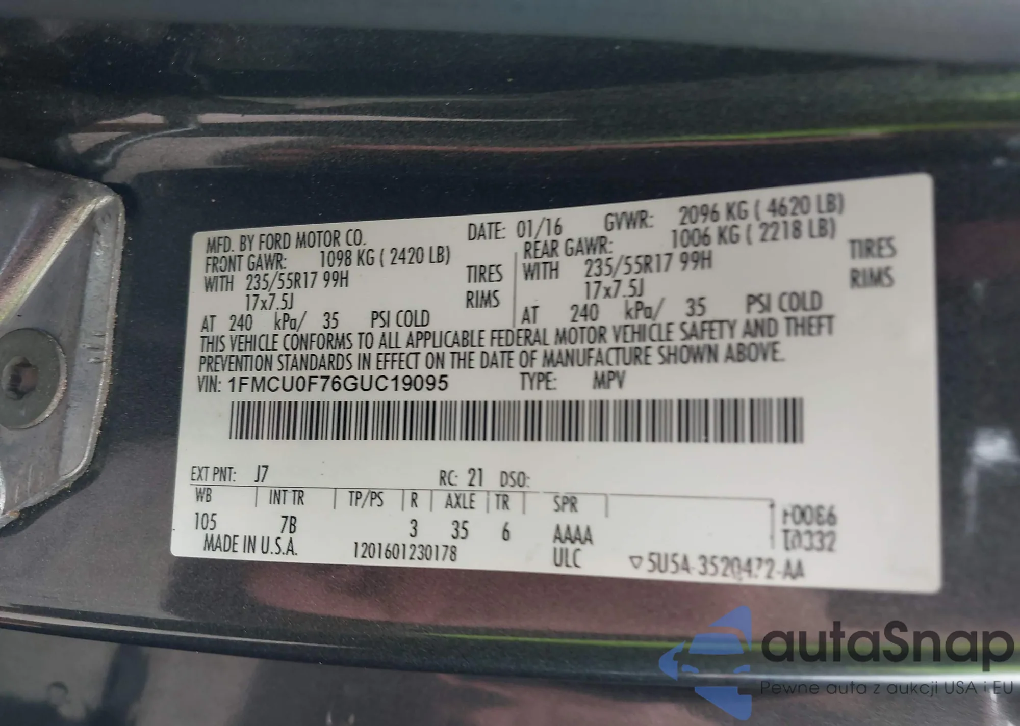 LOT: 43080458 VIN: 1FMCU0F76GUC19095