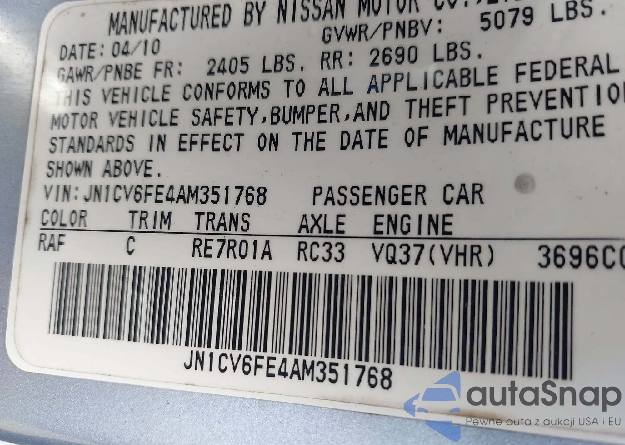 LOT: 43123630 VIN: JN1CV6FE4AM351768