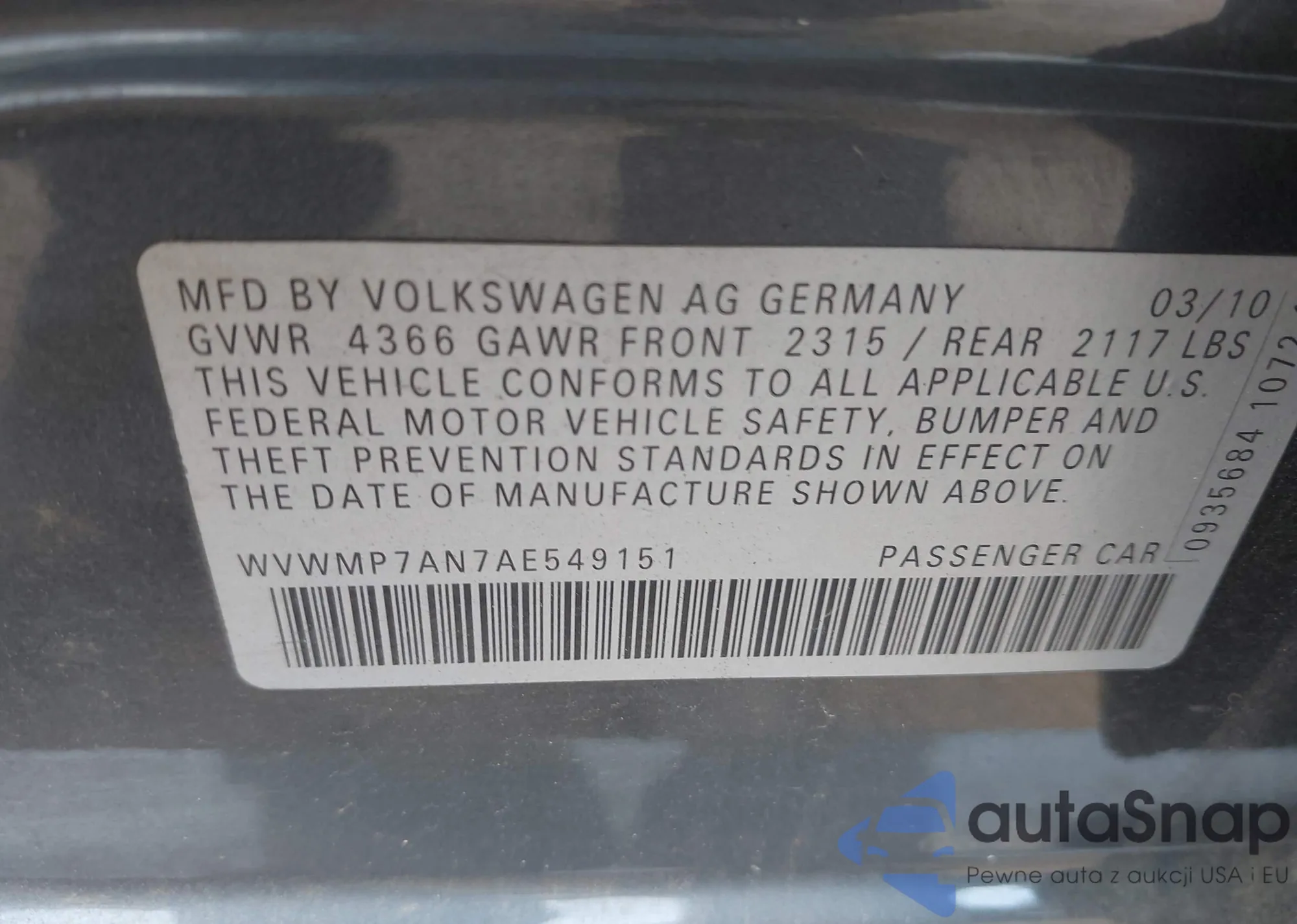 • VIN WVWMP7AN7AE549151
