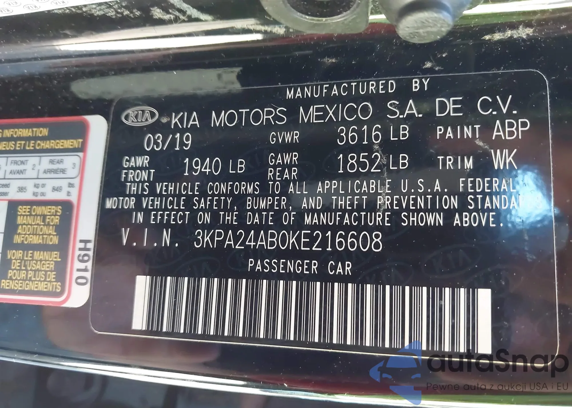 • VIN 3KPA24AB0KE216608