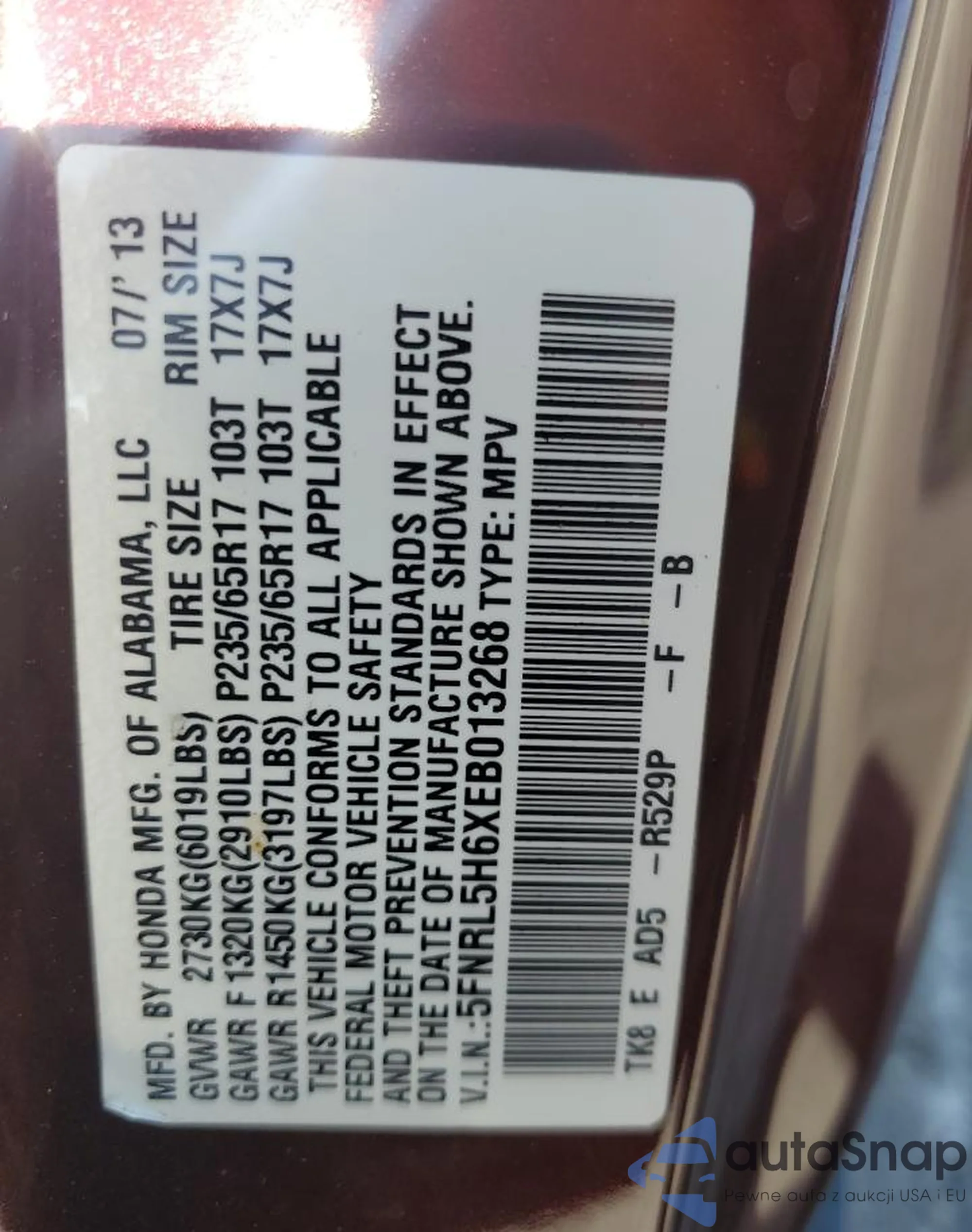 • VIN 5FNRL5H6XEB013268